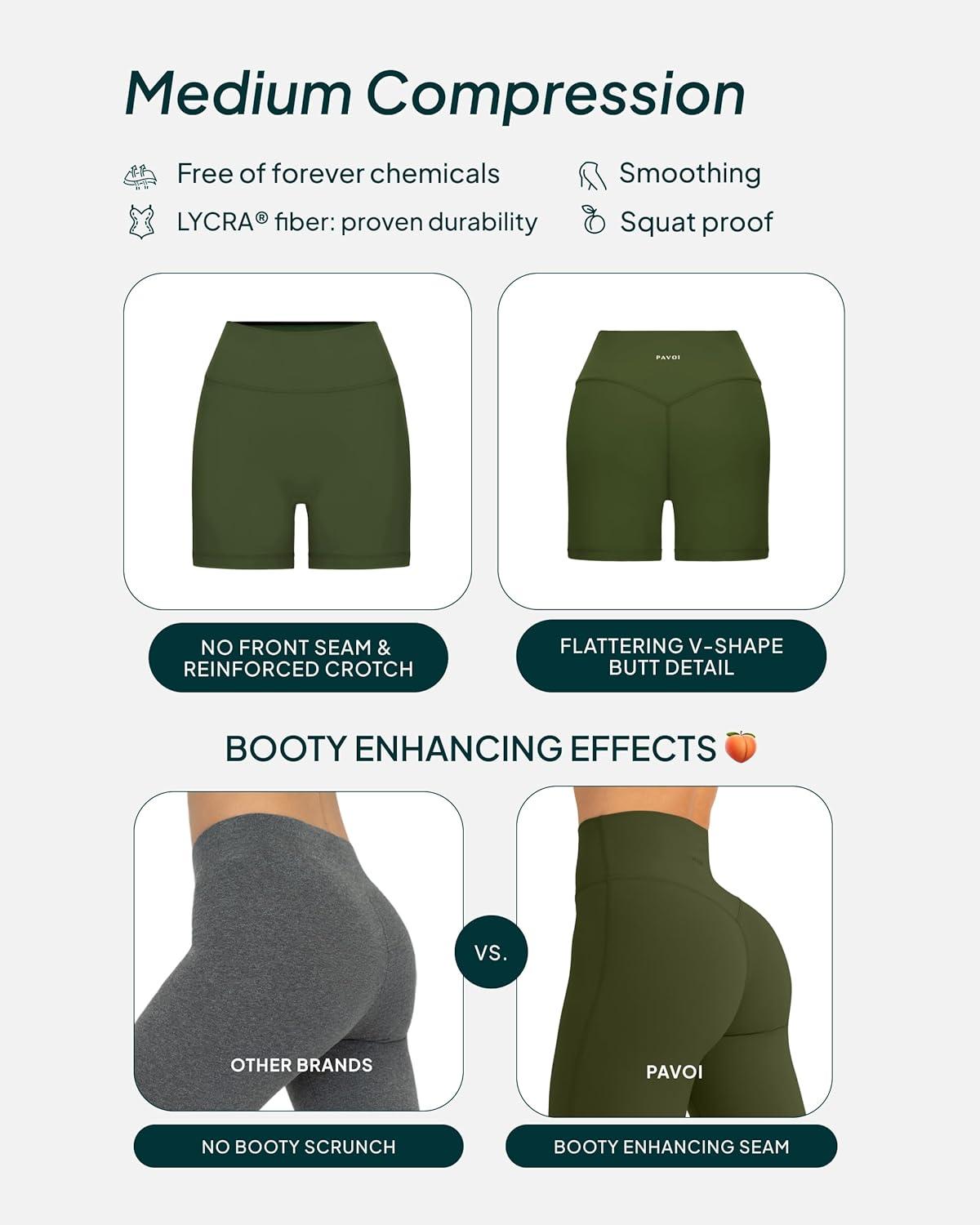 PAVOI ACTIVE Shorts with Pockets | Compressive High Waisted Butt Sculpting 4″ & 6″ Women’s Biker Shorts | HiPerform XXS to 3X(Army)