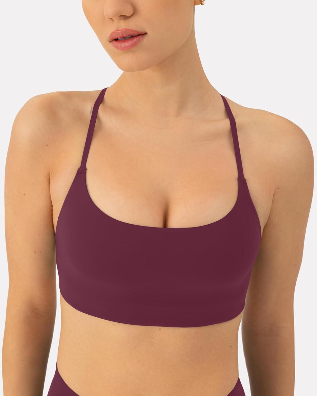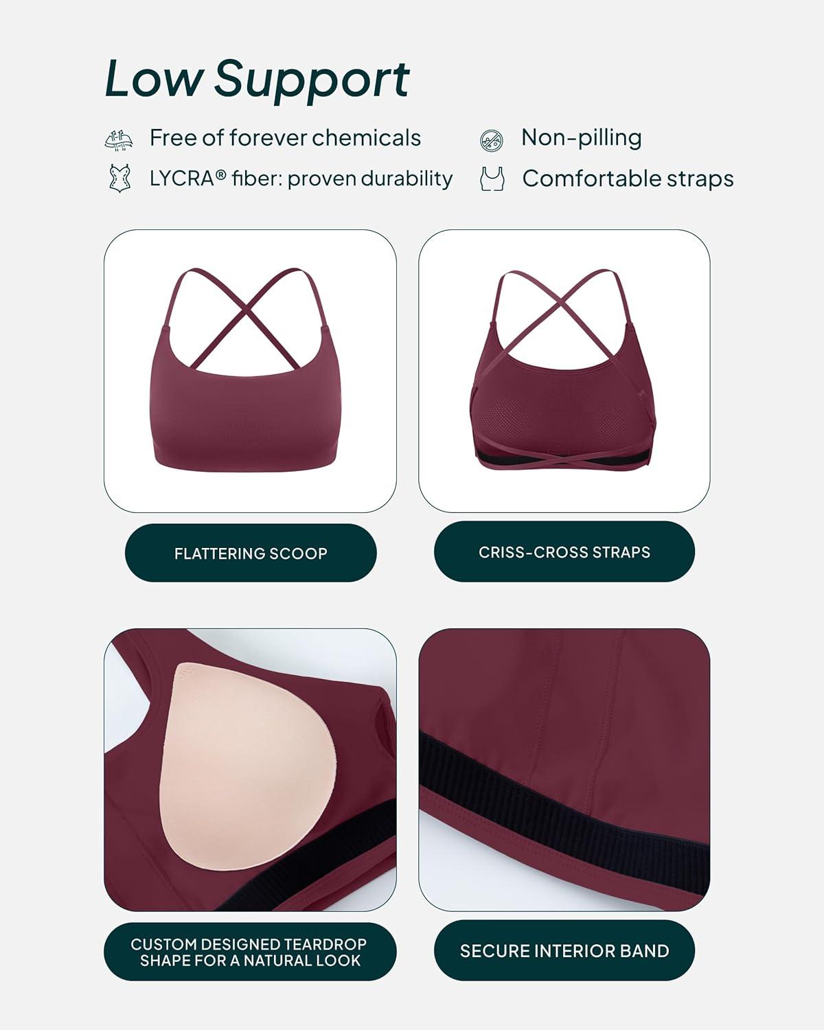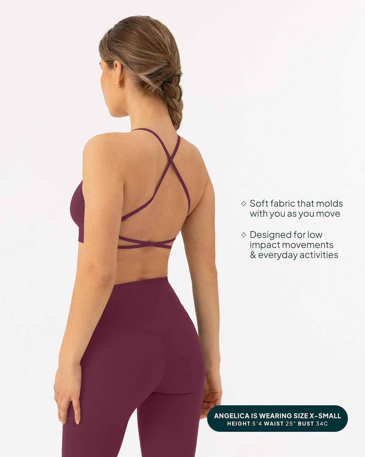 PAVOI ACTIVE Open Back Strappy Yoga Workout Bras for Women – Low Support Criss-Cross Sports Gym Bra Removable Pads – FlexFlow, Small, Bordeaux