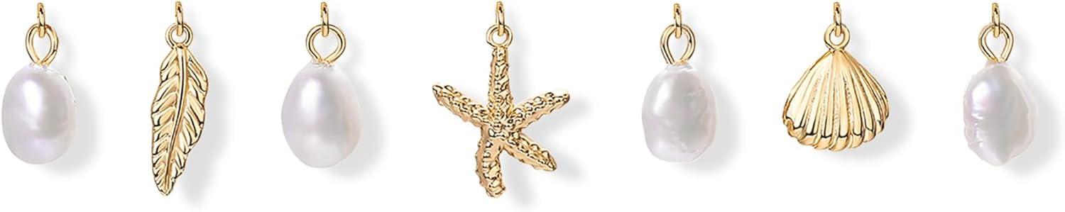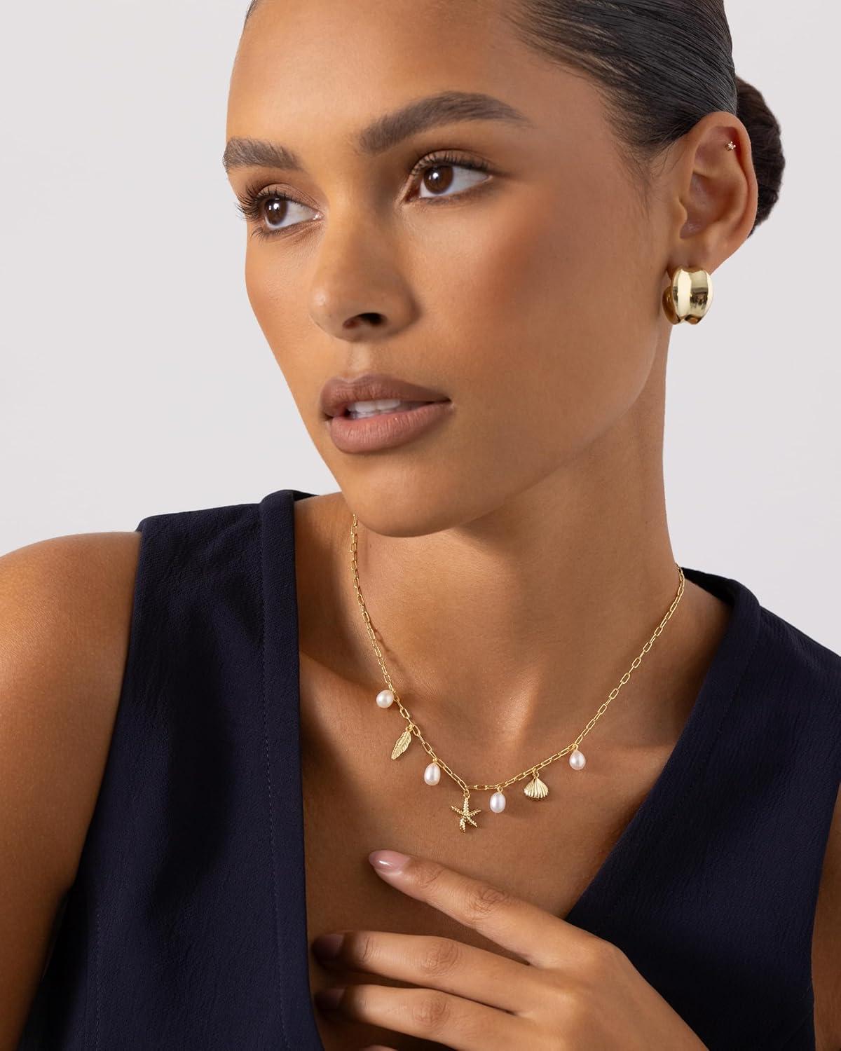 PAVOI 14K Gold Plated Beach Charm Necklace for Women – Dainty Paperclip Chain Trendy Beachy Multi Charm Necklace – Gold Ocean Summer Jewelry with Freshwater Pearl, Sea Shell, Starfish(Yellow Gold)