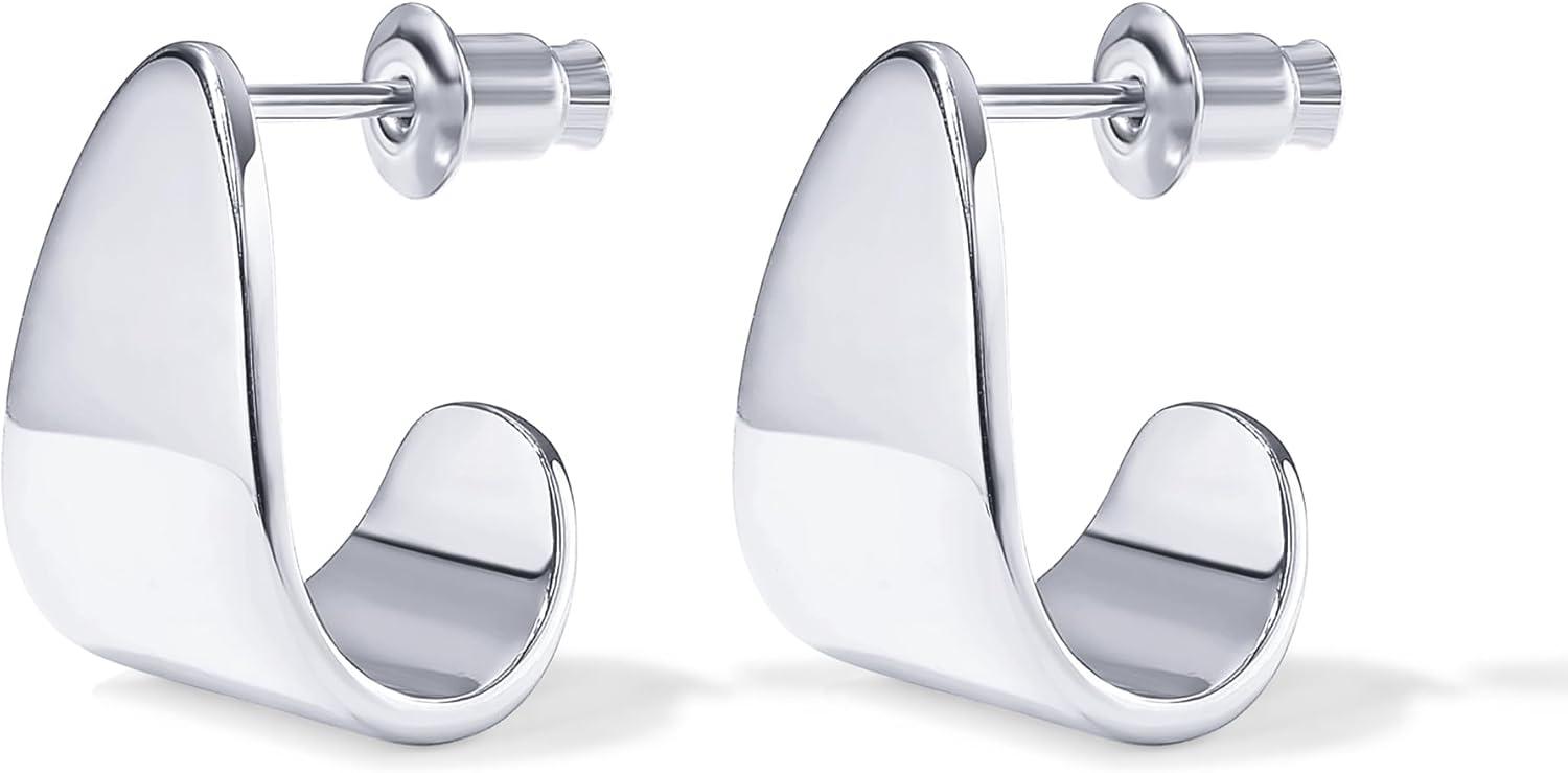 PAVOI 14K Gold Plated 925 Sterling Silver Posts Chunky Hoop Earrings | Statement Huggie Hoops for Women | Lightweight Gold Dome Earrings(White Gold)