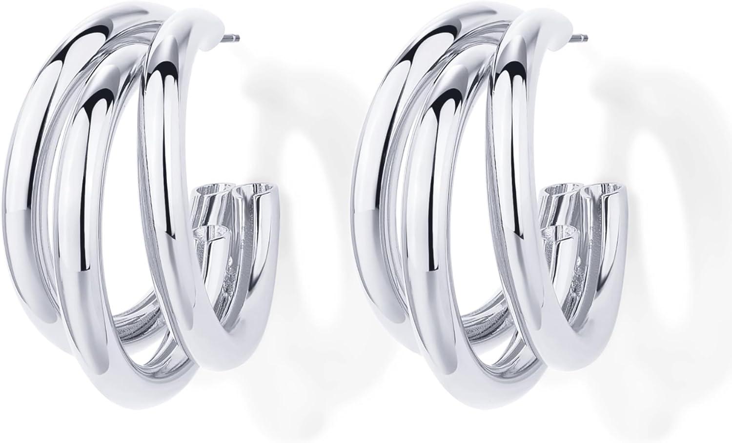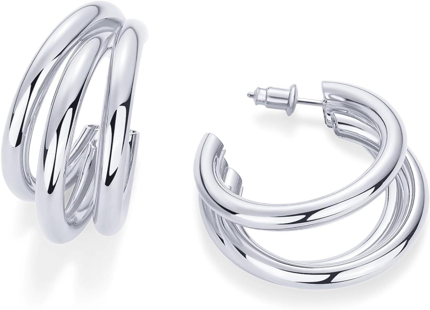 PAVOI 14K Gold Plated Chunky Multi Hoop Earrings for Women | Hypoallergenic Trendy Triple Split Loop Huggie Earrings(White Gold)