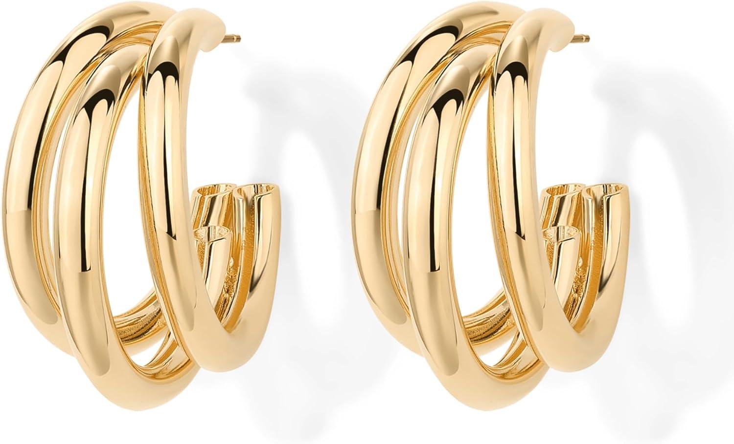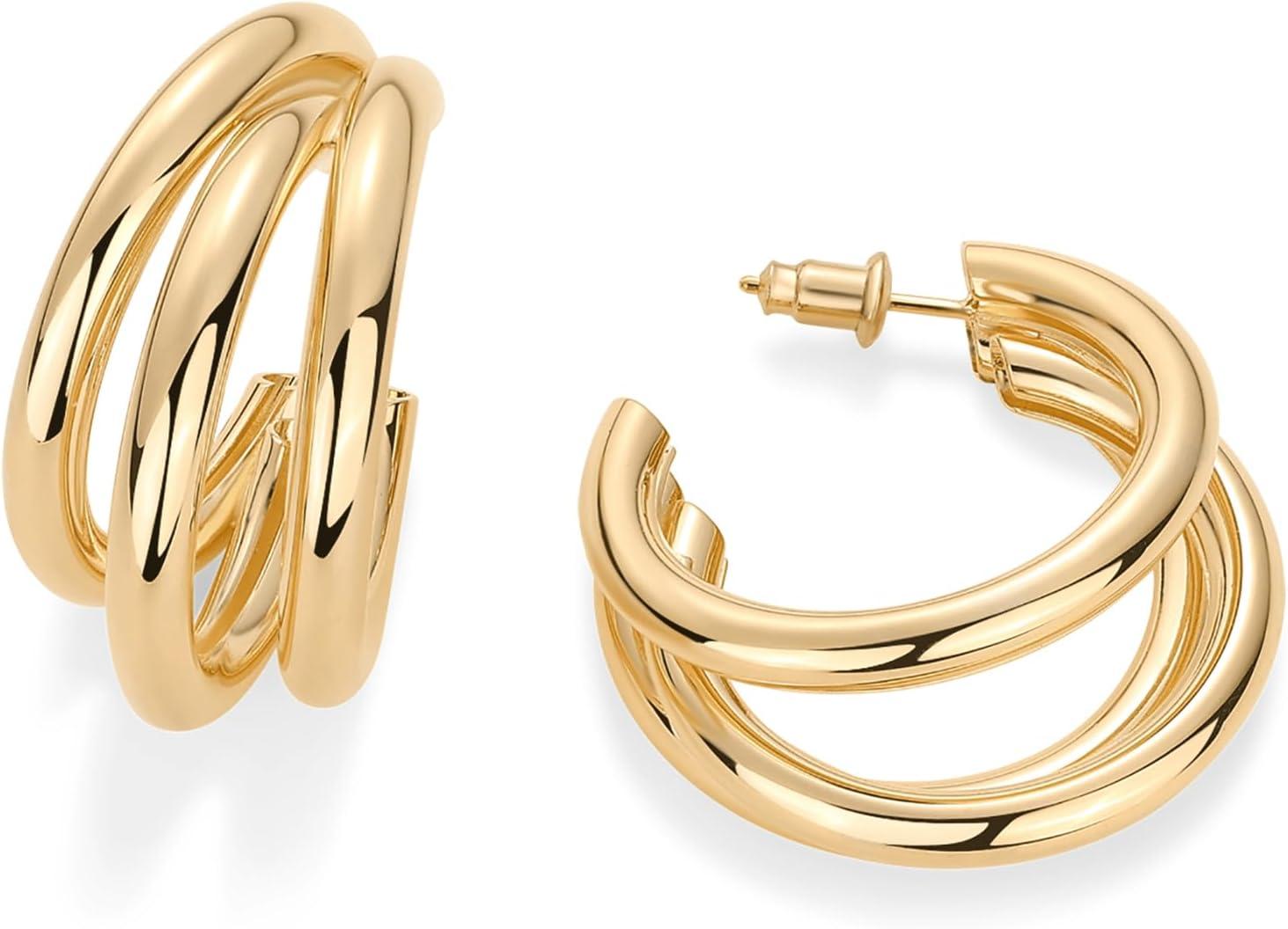 PAVOI 14K Gold Plated Chunky Multi Hoop Earrings for Women | Hypoallergenic Trendy Triple Split Loop Huggie Earrings(Yellow Gold)