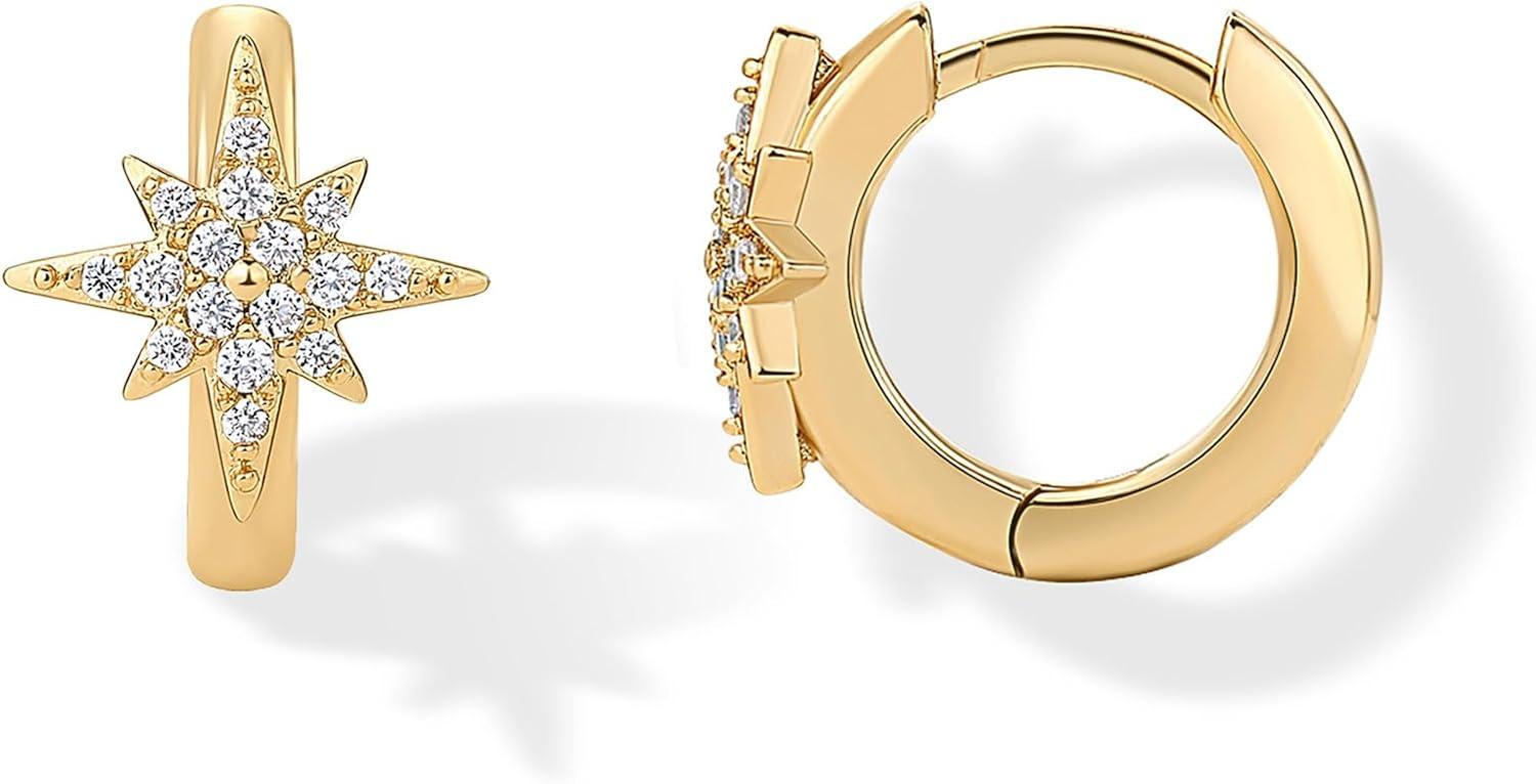PAVOI 14K Gold Plated 925 Sterling Silver Posts Small Huggie Hoop Earrings for Women – Trendy Celestial North Star, Butterfly, Heart Hoop Earrings – Cubic Zirconia Cute Gold Motif Jewelry(North Star)