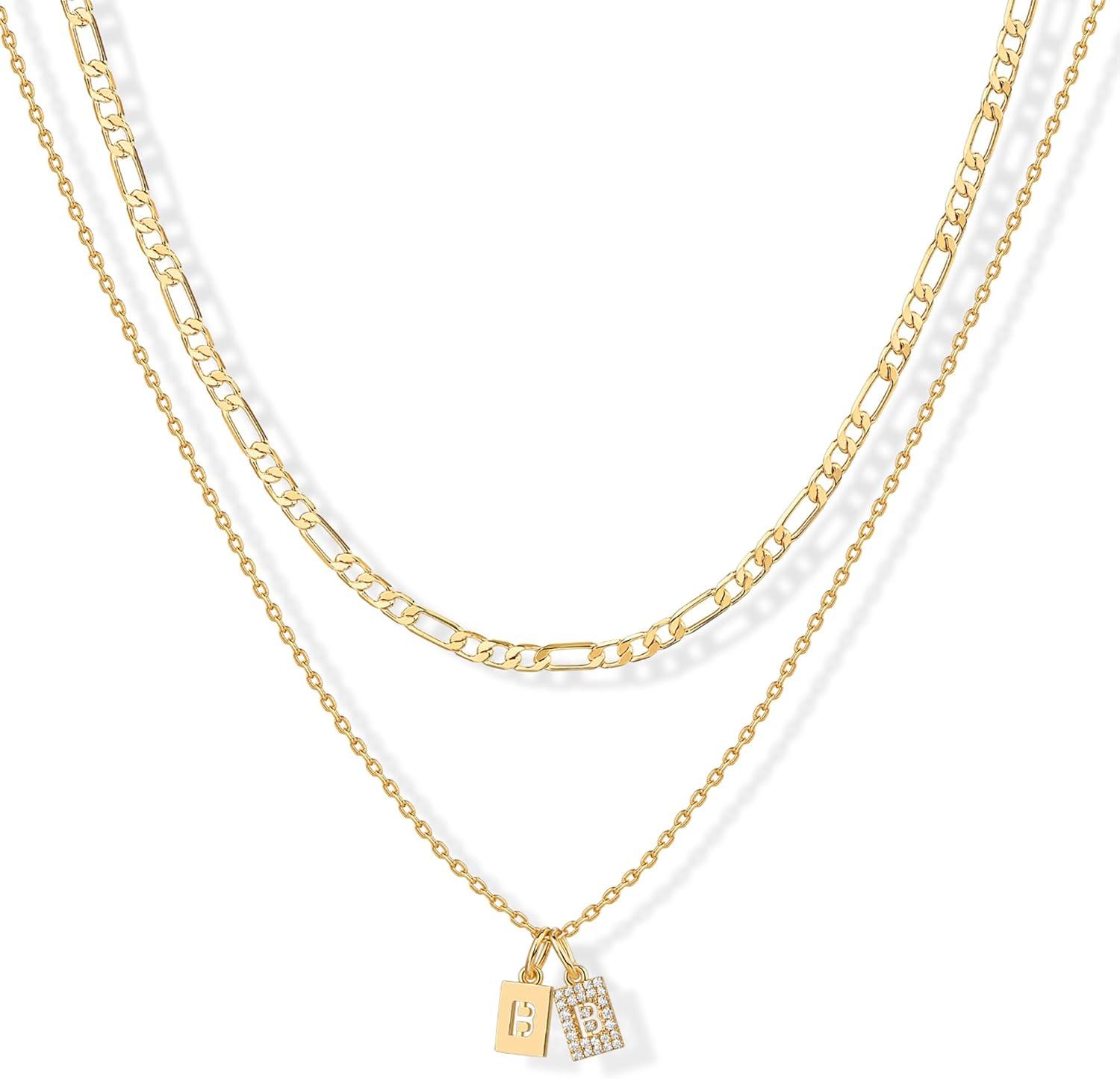 PAVOI 14K Gold Plated Initial Letter Double Dog Tag Pendant Necklace | Dainty Cubic Zirconia Letter Tag Round Box Chain Necklaces for Women(- B)