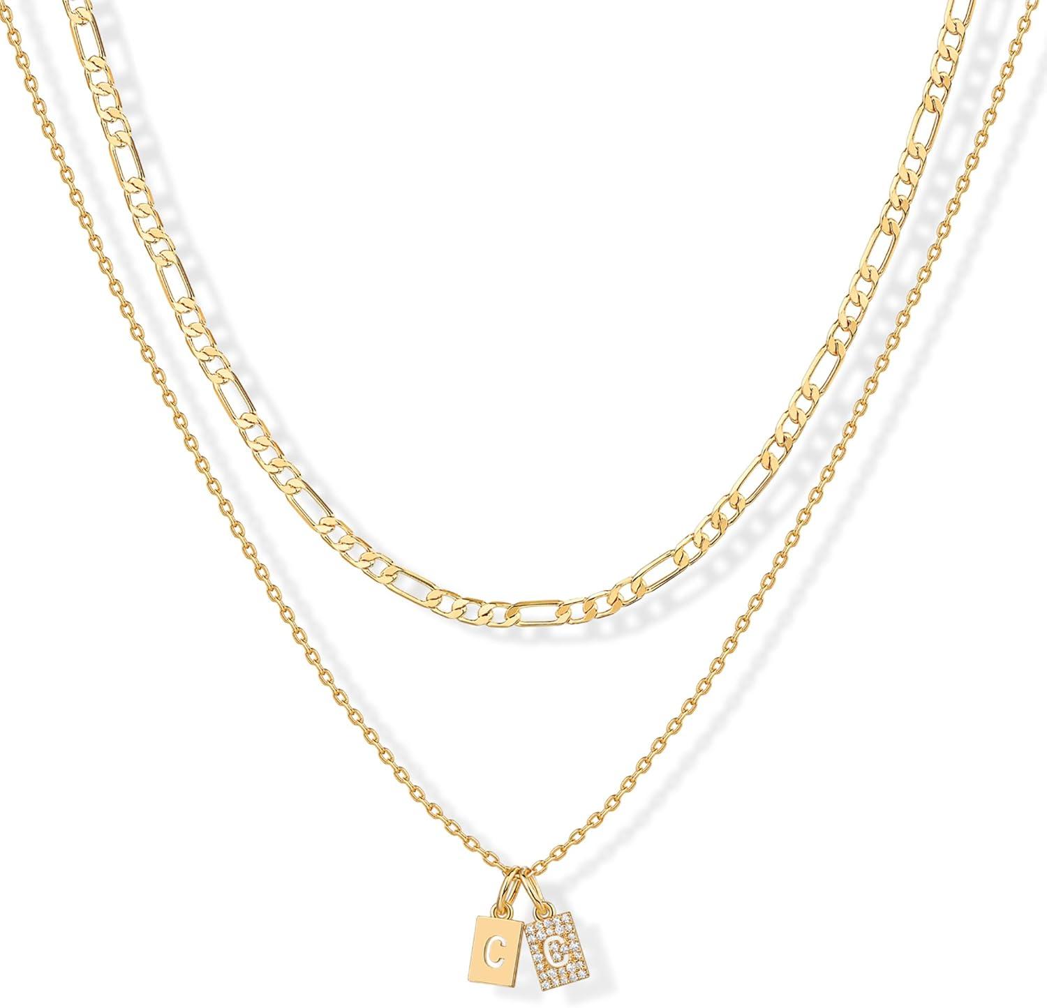 PAVOI 14K Gold Plated Initial Letter Double Dog Tag Pendant Necklace | Dainty Cubic Zirconia Letter Tag Round Box Chain Necklaces for Women(- C)