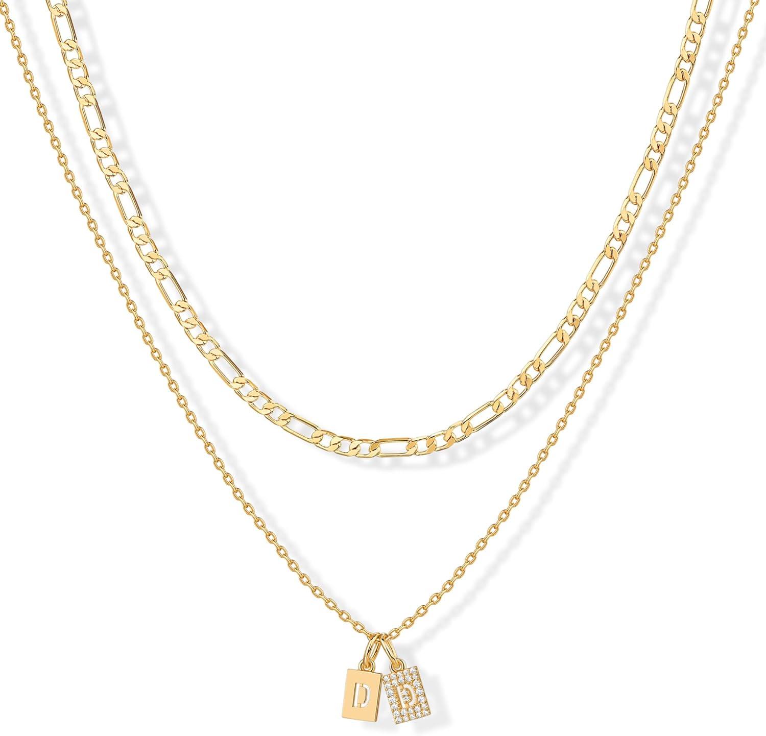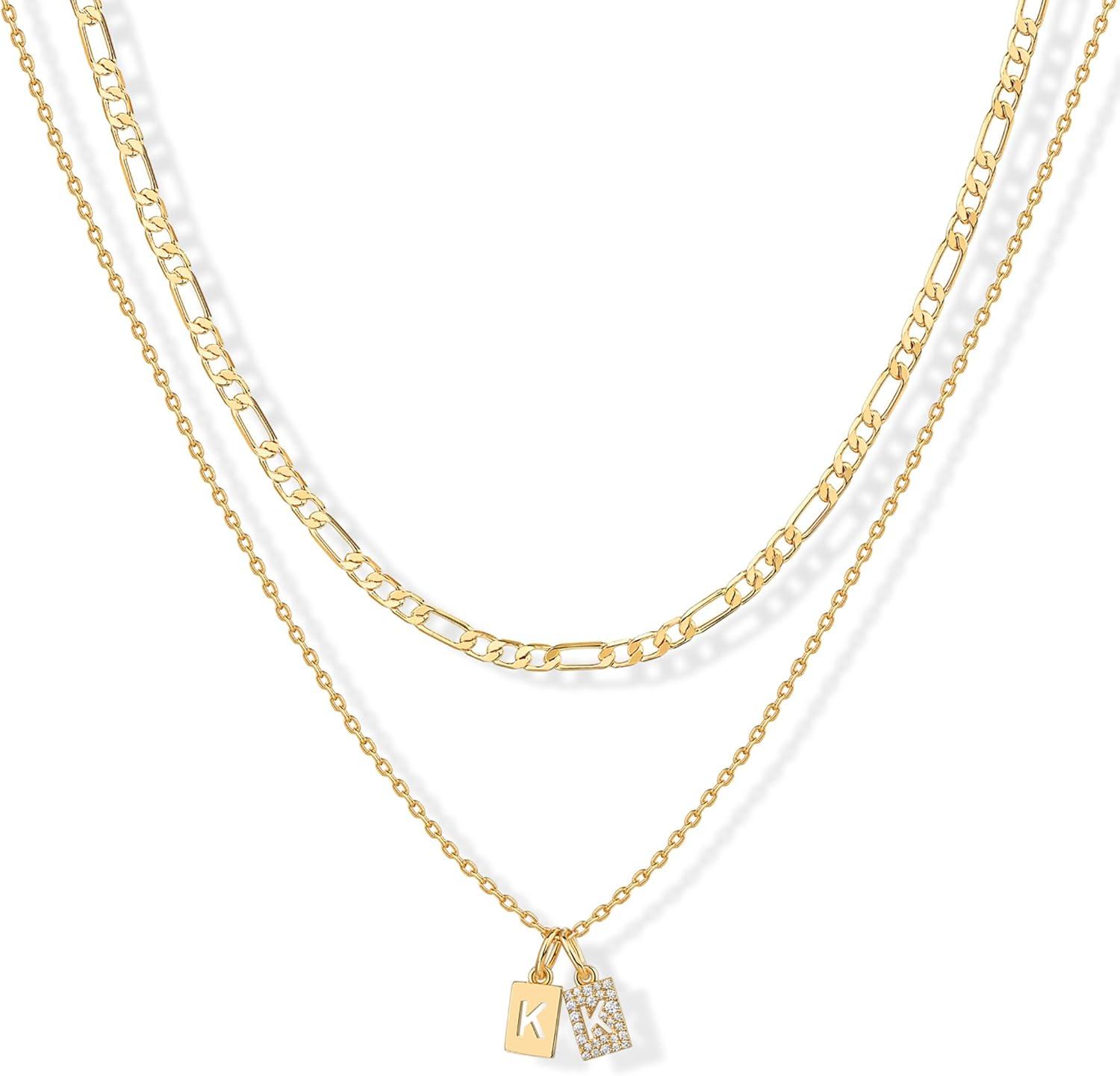PAVOI 14K Gold Plated Initial Letter Double Dog Tag Pendant Necklace | Dainty Cubic Zirconia Letter Tag Round Box Chain Necklaces for Women(- K)