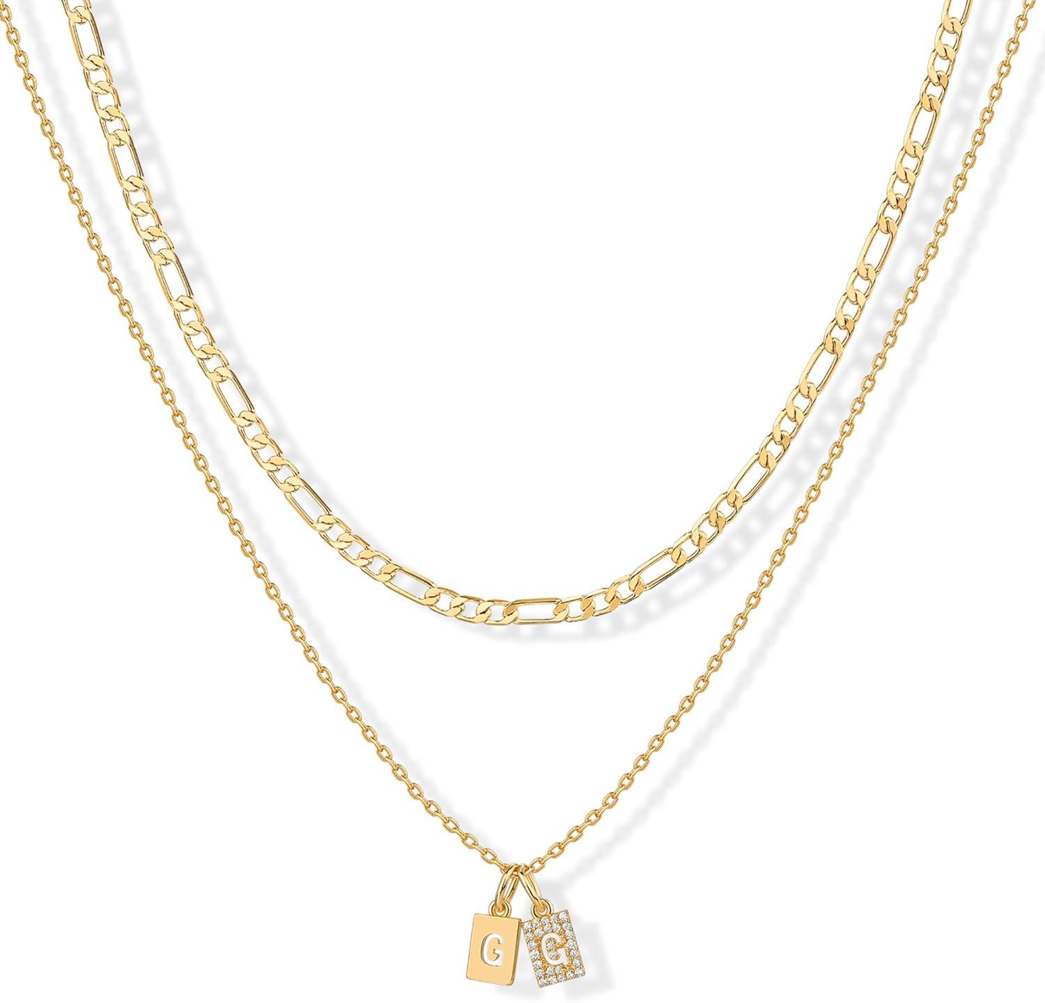 PAVOI 14K Gold Plated Initial Letter Double Dog Tag Pendant Necklace | Dainty Cubic Zirconia Letter Tag Round Box Chain Necklaces for Women(- G)