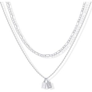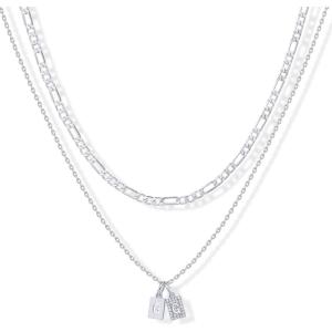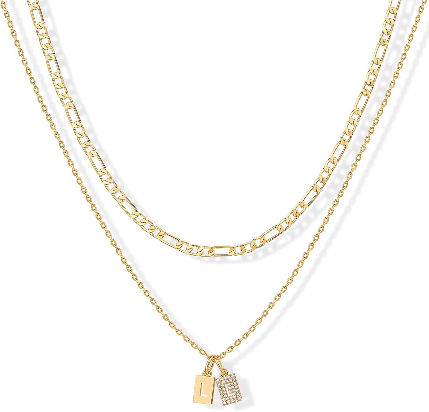 PAVOI 14K Gold Plated Initial Letter Double Dog Tag Pendant Necklace | Dainty Cubic Zirconia Letter Tag Round Box Chain Necklaces for Women(- L)