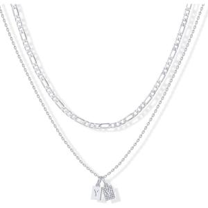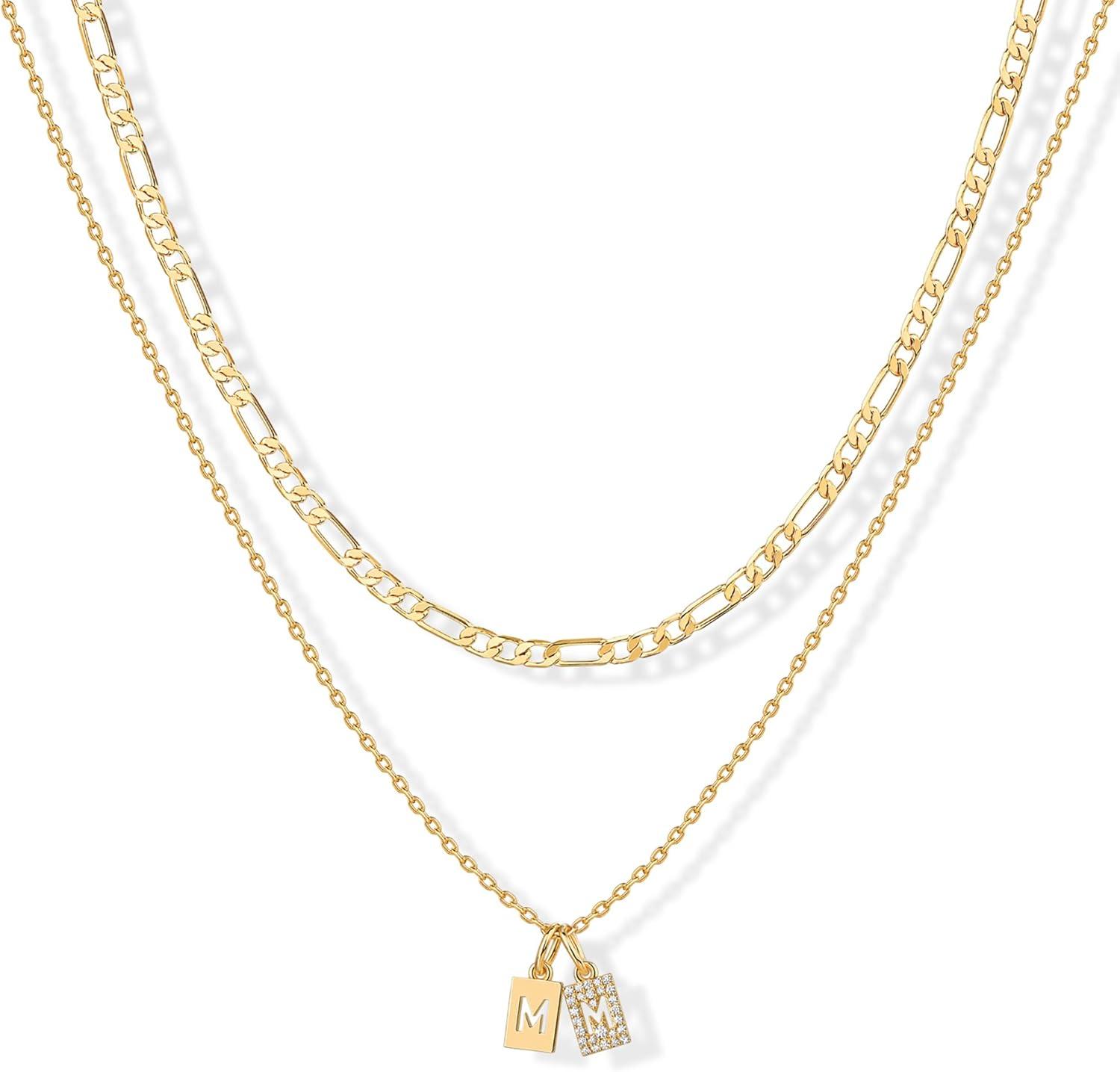 PAVOI 14K Gold Plated Initial Letter Double Dog Tag Pendant Necklace | Dainty Cubic Zirconia Letter Tag Round Box Chain Necklaces for Women(- M)