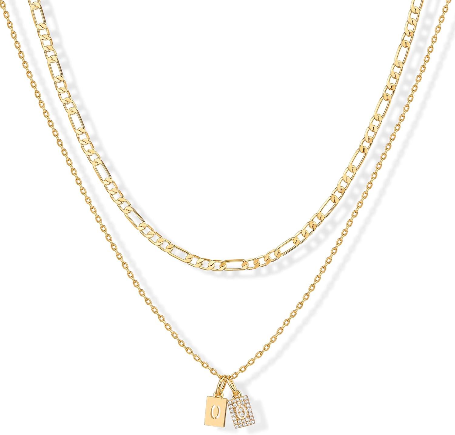 PAVOI 14K Gold Plated Initial Letter Double Dog Tag Pendant Necklace | Dainty Cubic Zirconia Letter Tag Round Box Chain Necklaces for Women(- O)