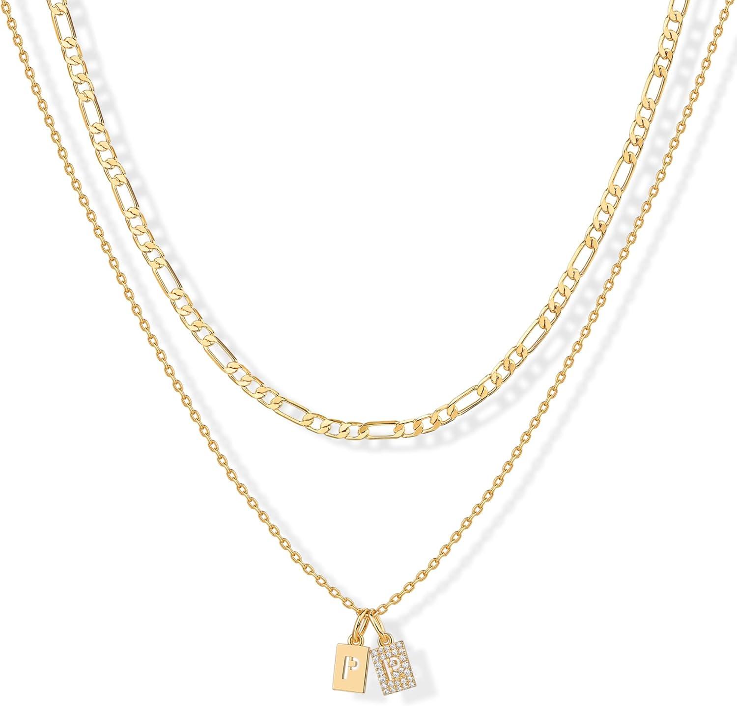PAVOI 14K Gold Plated Initial Letter Double Dog Tag Pendant Necklace | Dainty Cubic Zirconia Letter Tag Round Box Chain Necklaces for Women(- P)
