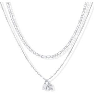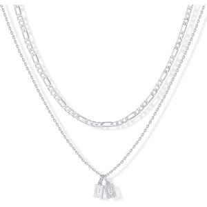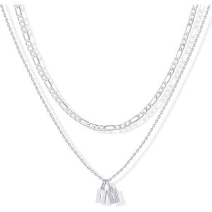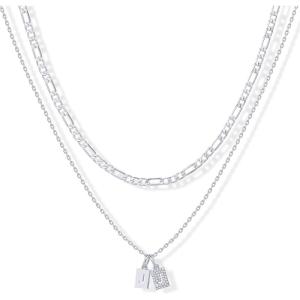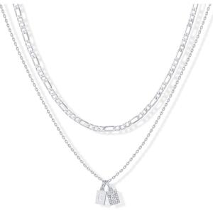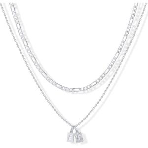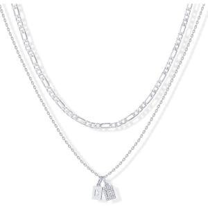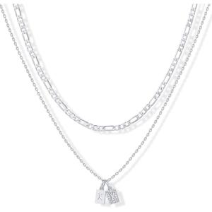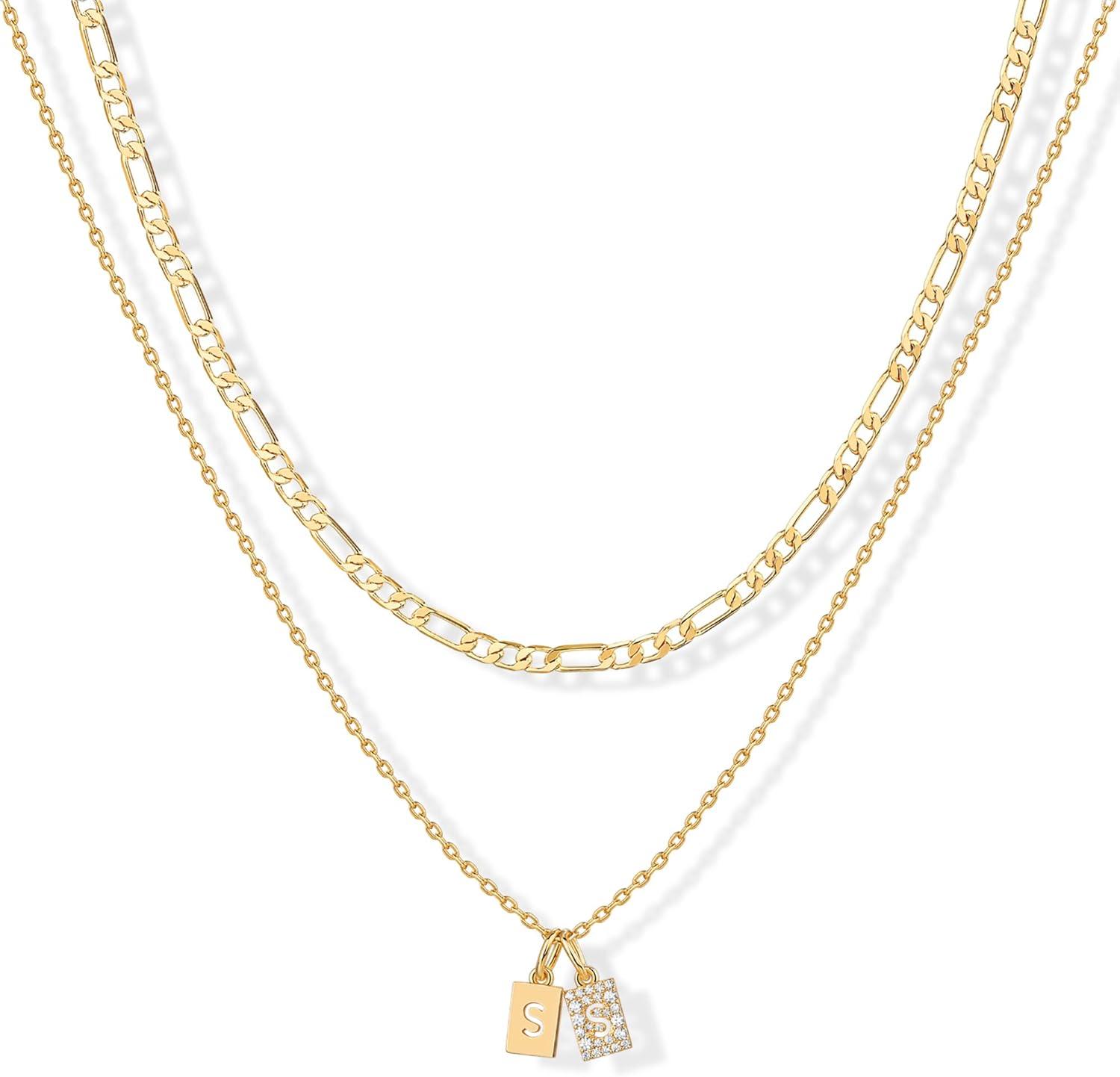 PAVOI 14K Gold Plated Initial Letter Double Dog Tag Pendant Necklace | Dainty Cubic Zirconia Letter Tag Round Box Chain Necklaces for Women(- S)