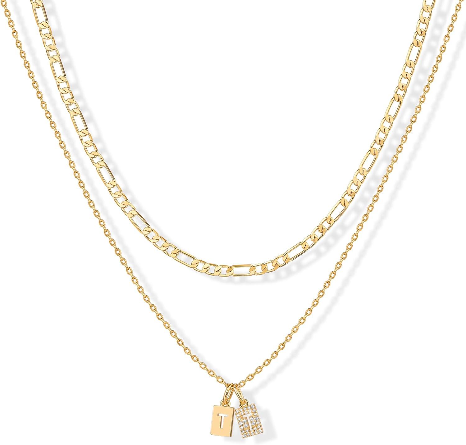 PAVOI 14K Gold Plated Initial Letter Double Dog Tag Pendant Necklace | Dainty Cubic Zirconia Letter Tag Round Box Chain Necklaces for Women(- T)
