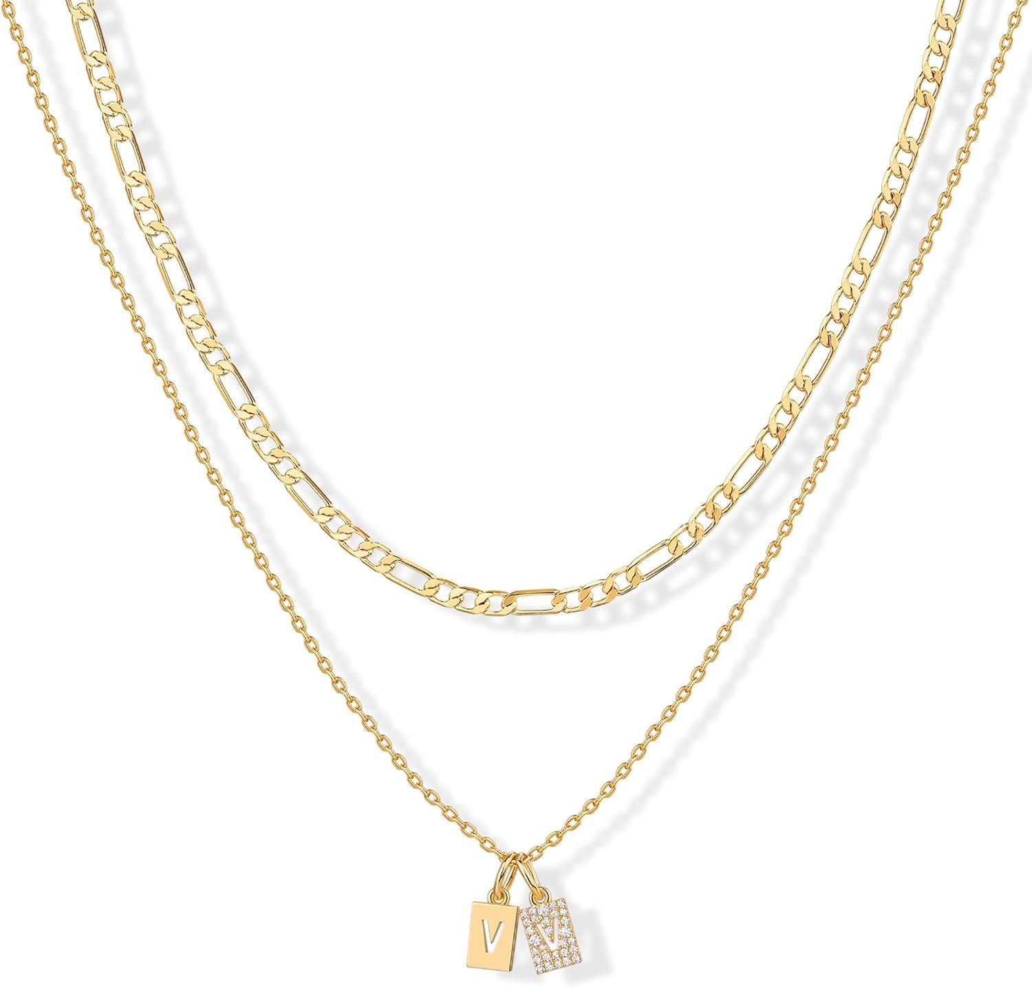 PAVOI 14K Gold Plated Initial Letter Double Dog Tag Pendant Necklace | Dainty Cubic Zirconia Letter Tag Round Box Chain Necklaces for Women(- V)