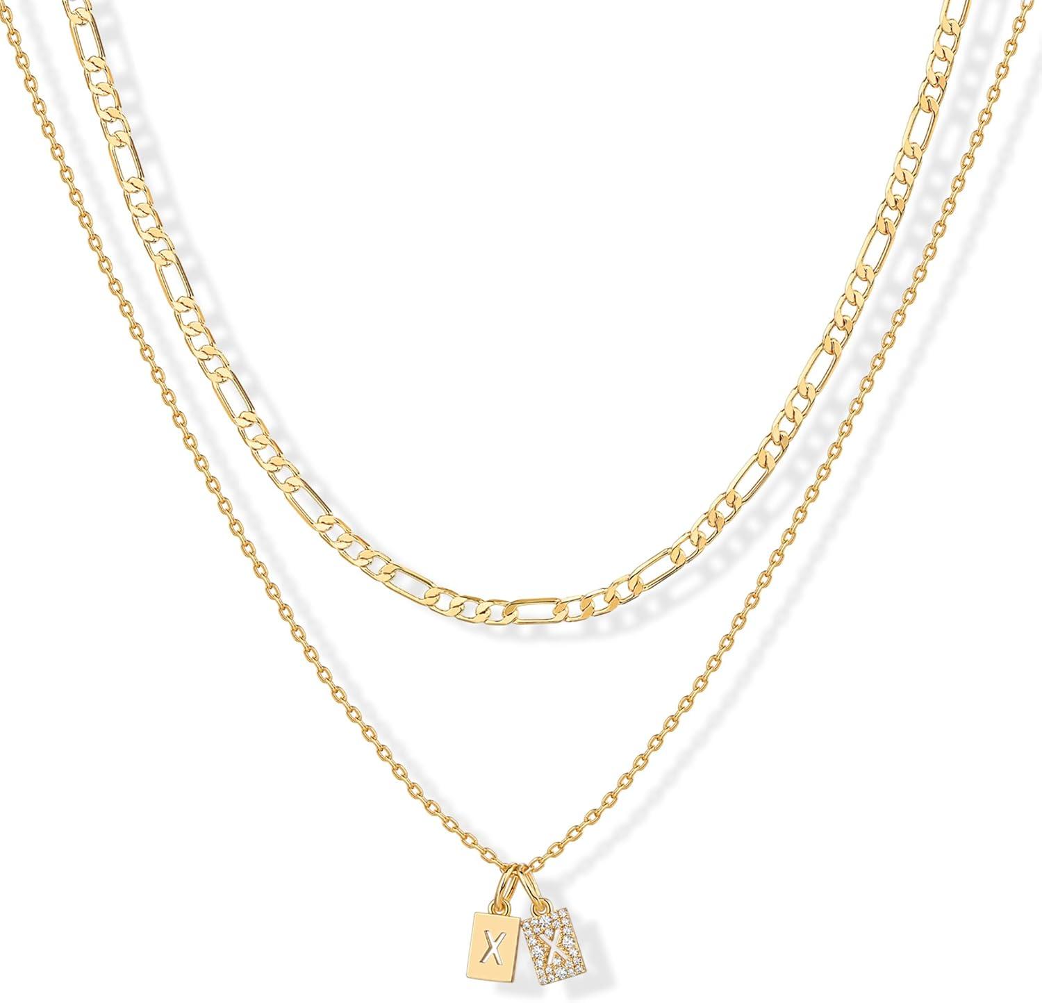 PAVOI 14K Gold Plated Initial Letter Double Dog Tag Pendant Necklace | Dainty Cubic Zirconia Letter Tag Round Box Chain Necklaces for Women(- X)