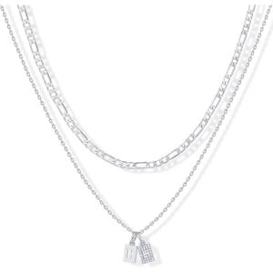PAVOI 14K Gold Plated Initial Letter Double Dog Tag Pendant Necklace | Dainty Cubic Zirconia Letter Tag Round Box Chain Necklaces for Women(- W)