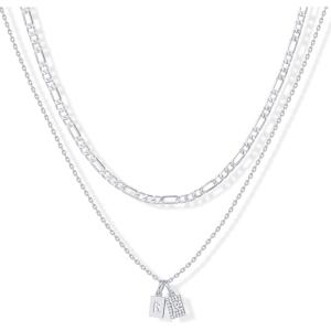 PAVOI 14K Gold Plated Initial Letter Double Dog Tag Pendant Necklace | Dainty Cubic Zirconia Letter Tag Round Box Chain Necklaces for Women(- N)