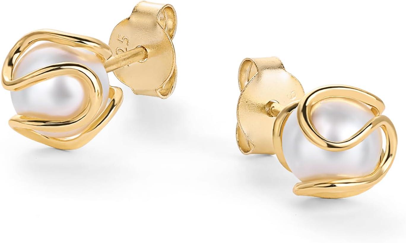 PAVOI 14K Gold Plated Round Caged Small Pearl Stud Earrings – Trendy Gold Pearl Earrings for Women – Hypoallergenic Classic Bride Jewelry(White Gold)