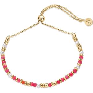 PAVOI 14K Yellow Gold Plated Gemstone Beaded Bracelets for Women – Adjustable Slider Dainty Pearl Bracelet – Boho Festival Pearls, Labradorite, Sodalite, Red Jade, Amazonite Beads – Gold Jewelry Gifts(Dyed Rose Jade)