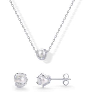 PAVOI 14K Gold Plated Round Shell Pearl Jewelry Set for Women – Gold Pearl Necklace and Earring Set with Pendant Necklace and Caged Stud Earrings Pack(White Gold)