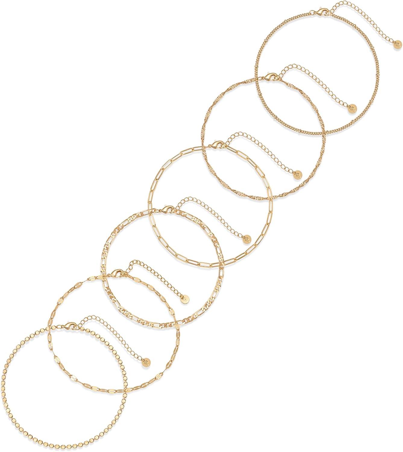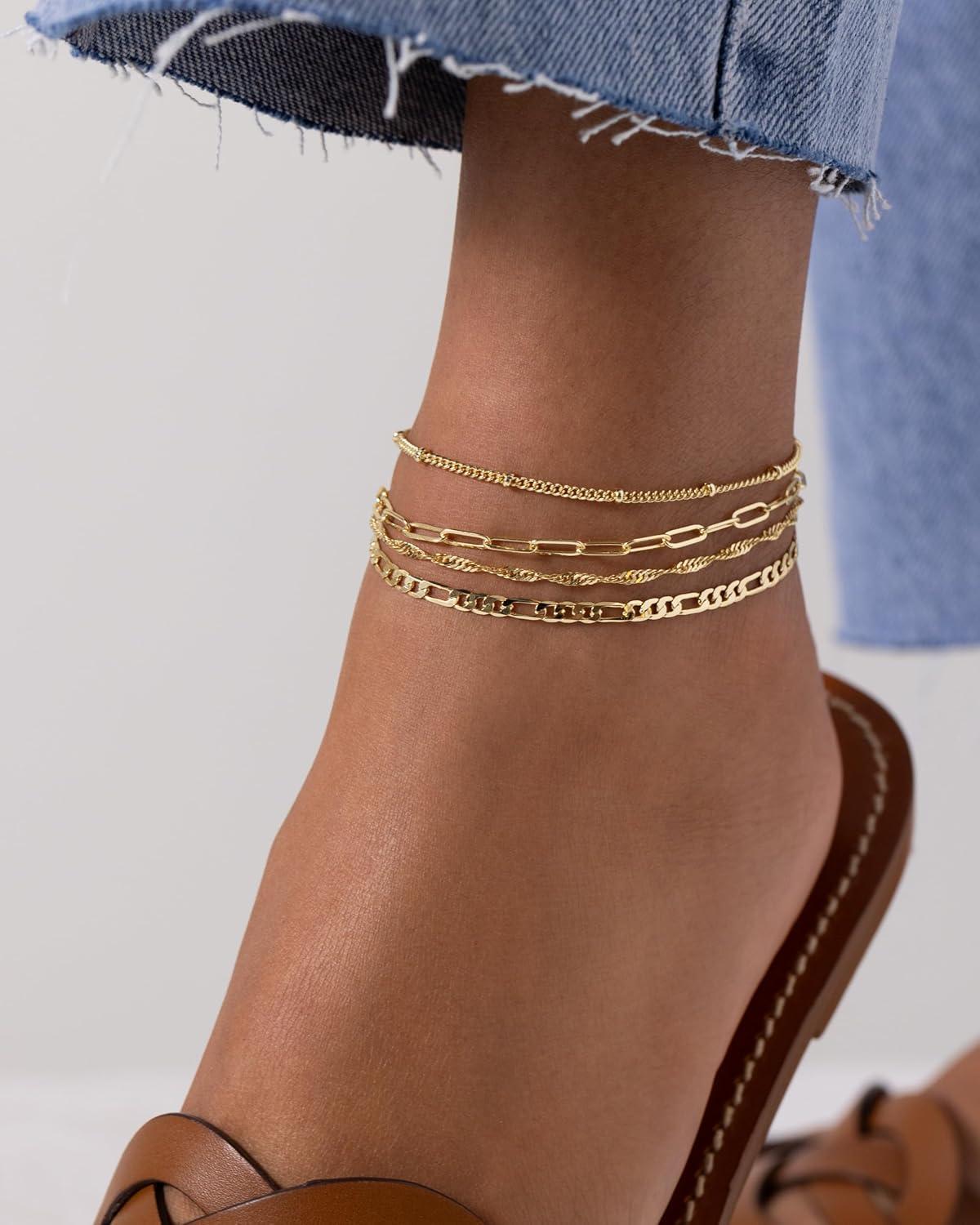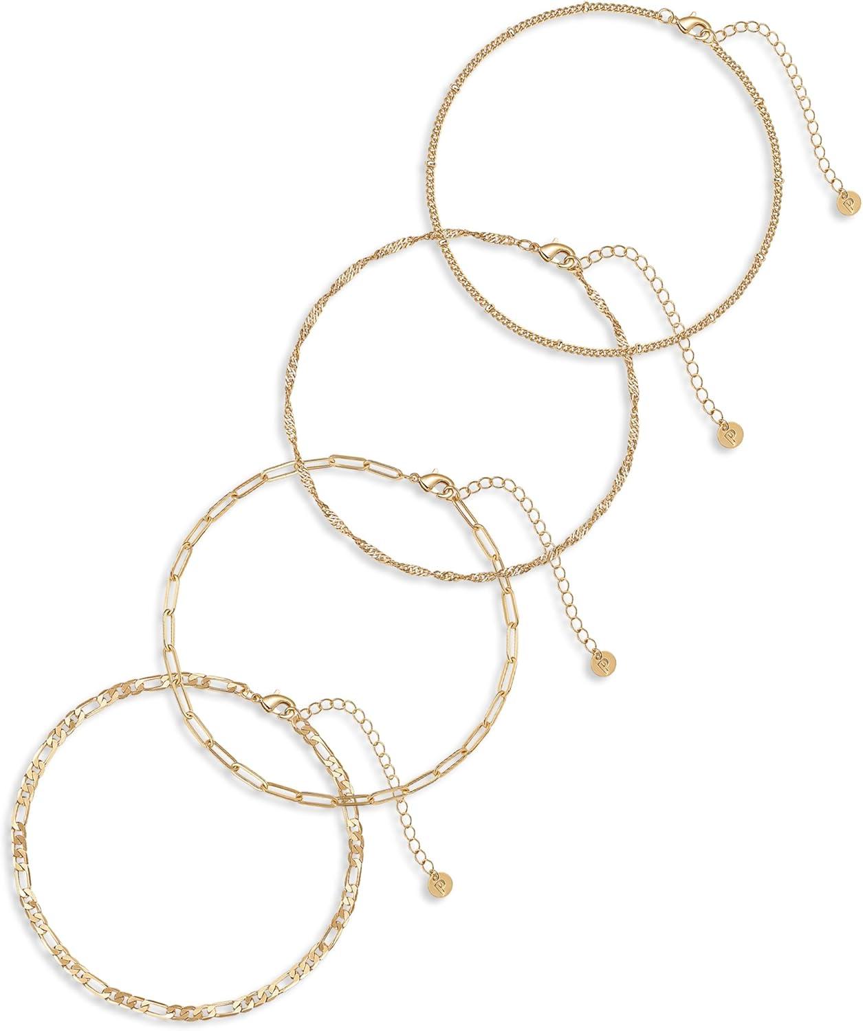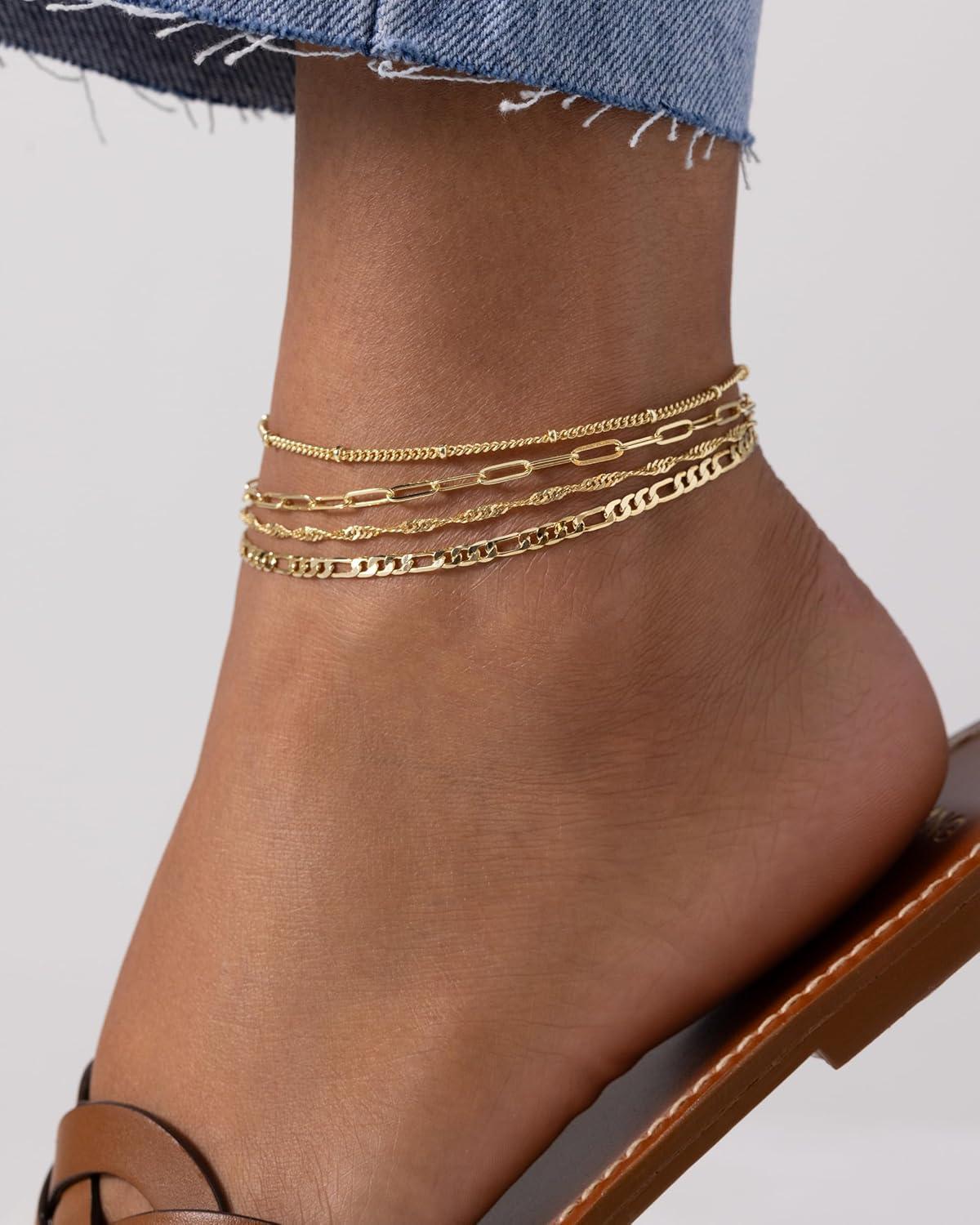 PAVOI 14K Gold Plated Chain Anklet Set – Lightweight 4-Pack Gold Anklets for Women – Trendy Summer Four Ankle Bracelets for Women – Fashion Rope, Figaro, Beaded Satellite, Paperclip Chain Jewelry(Yellow Gold)