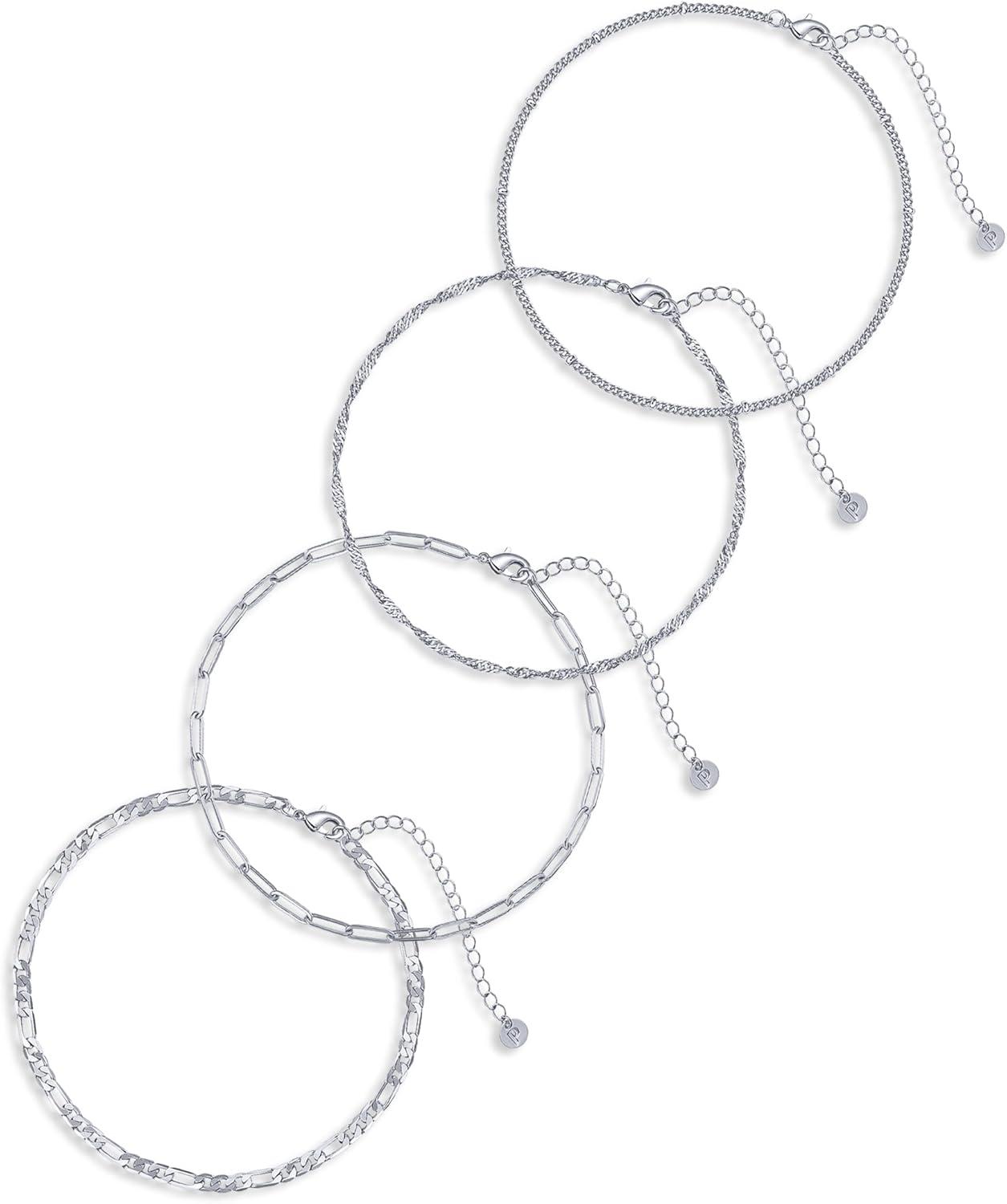 PAVOI 14K Gold Plated Chain Anklet Set – Lightweight 4-Pack Gold Anklets for Women – Trendy Summer Four Ankle Bracelets for Women – Fashion Rope, Figaro, Beaded Satellite, Paperclip Chain Jewelry(White Gold)