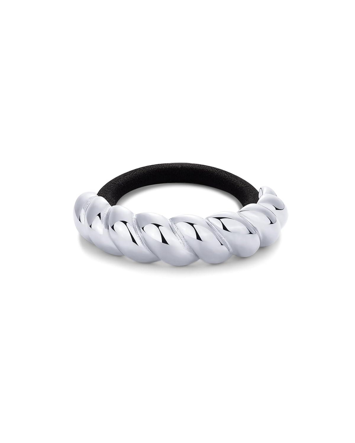 PAVOI 14K Yellow Gold Plated Waterproof Chunky Croissant Metal Hair Cuff for Women – Stainless Steel Statement Ponytail Cuff Fashion Accessories – Twisted Stretchy Gold Hair Ties for Ponytails(Twisted White Gold)