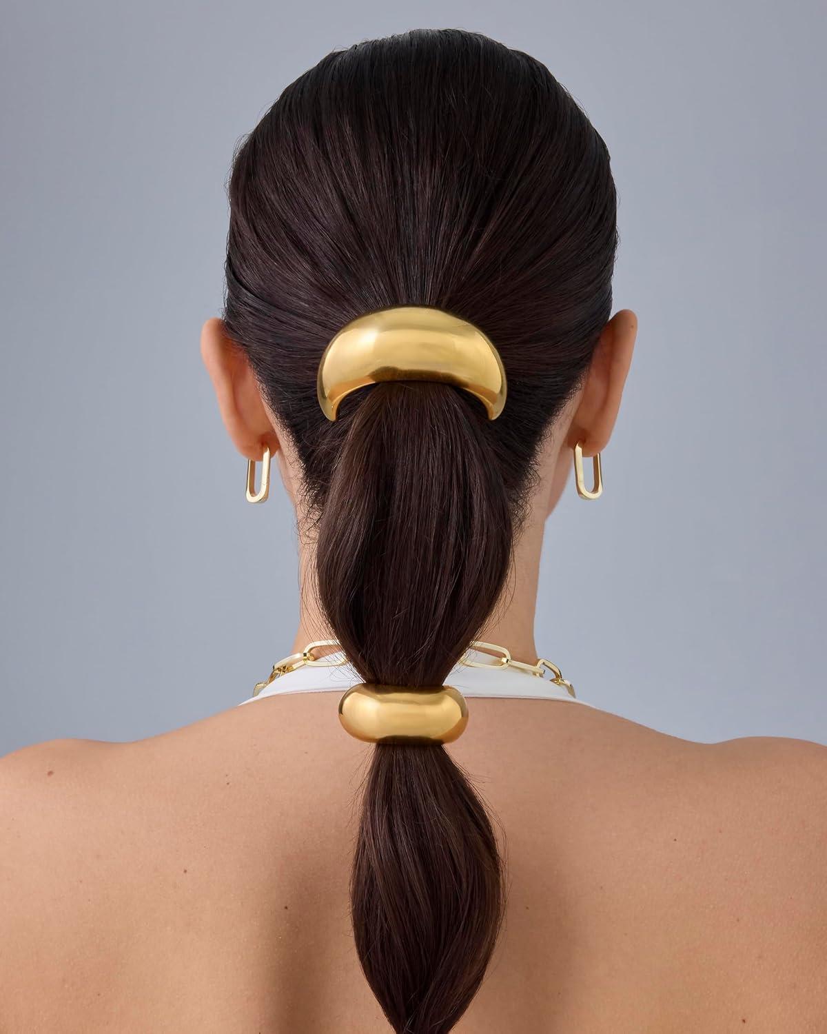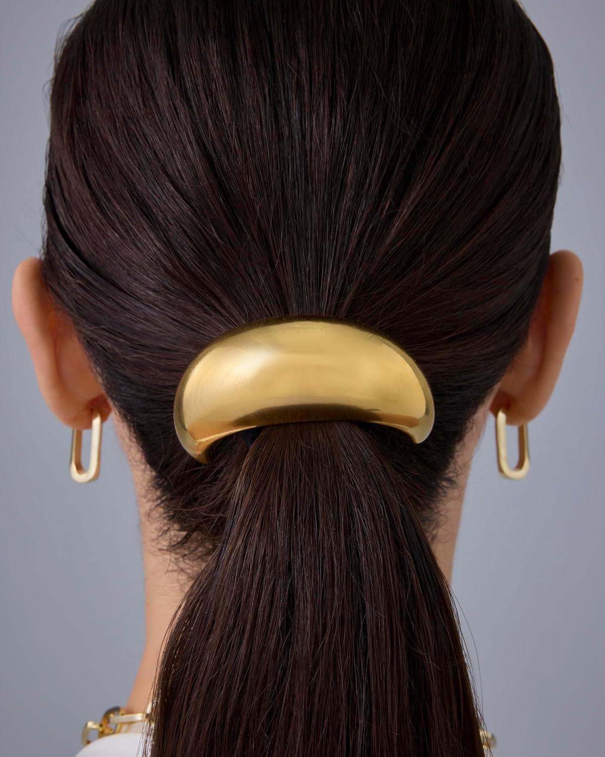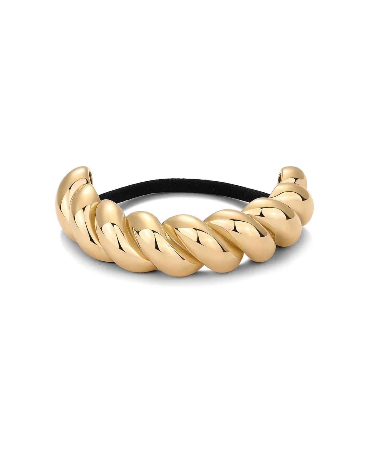 PAVOI 14K Yellow Gold Plated Waterproof Chunky Croissant Metal Hair Cuff for Women – Stainless Steel Statement Ponytail Cuff Fashion Accessories – Twisted Stretchy Gold Hair Ties for Ponytails(Croissant Yellow Gold)
