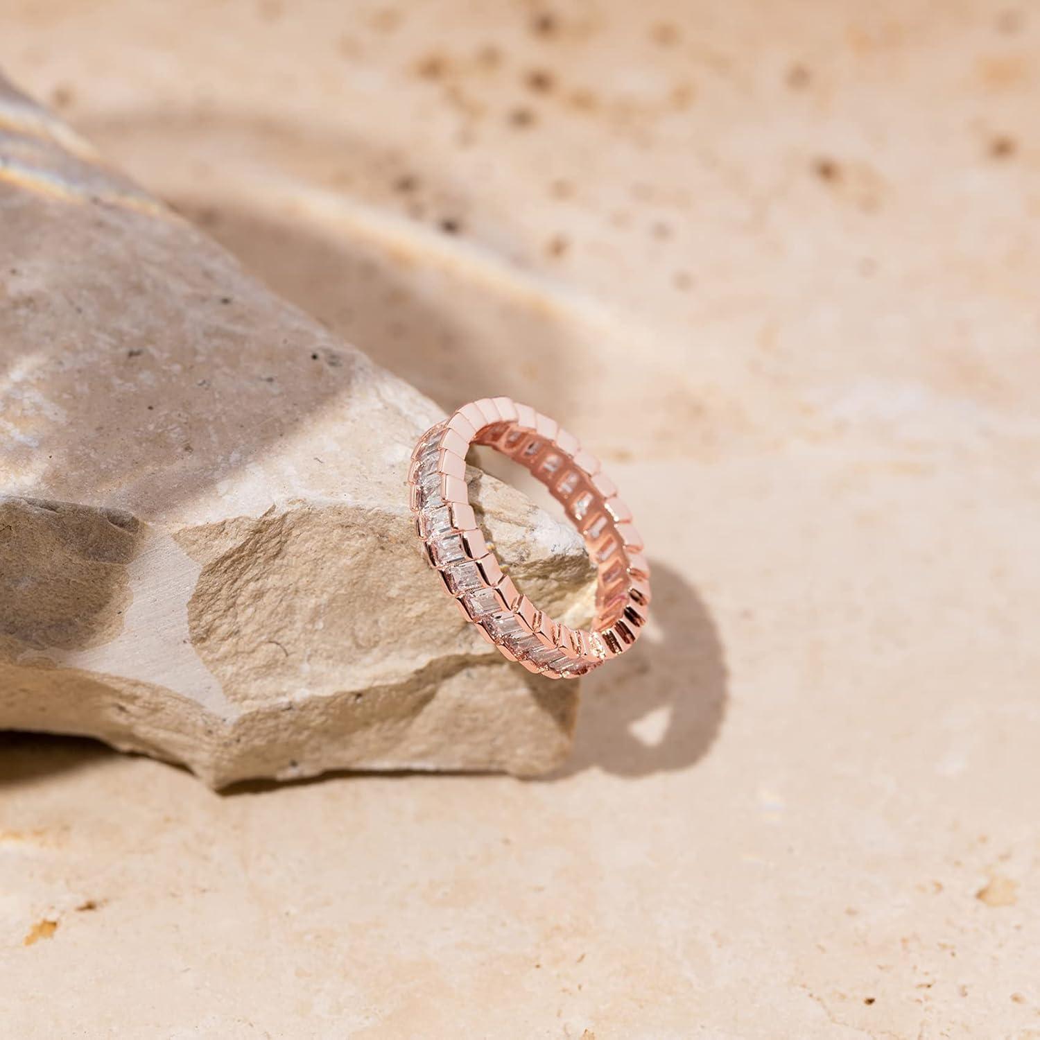PAVOI 14K Gold Plated Cubic Zirconia Baguette Cut Eternity Bands for Women(Rose Gold)