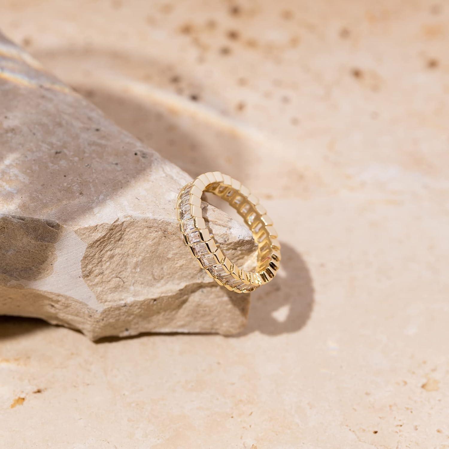 PAVOI 14K Gold Plated Cubic Zirconia Baguette Cut Eternity Bands for Women(Yellow Gold)