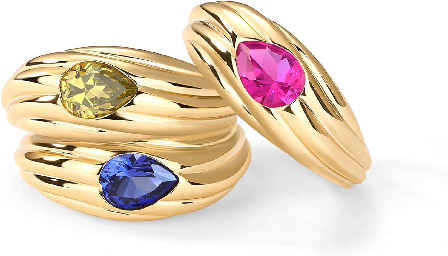 PAVOI 14K Gold Plated Chunky Colored Gemstones Statement Ring for Women | Blue Pink Green Pear Cubic Zirconia Stackable Wave Texture Bands(Yellow Gold)