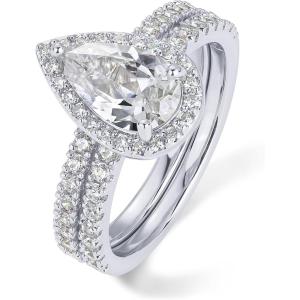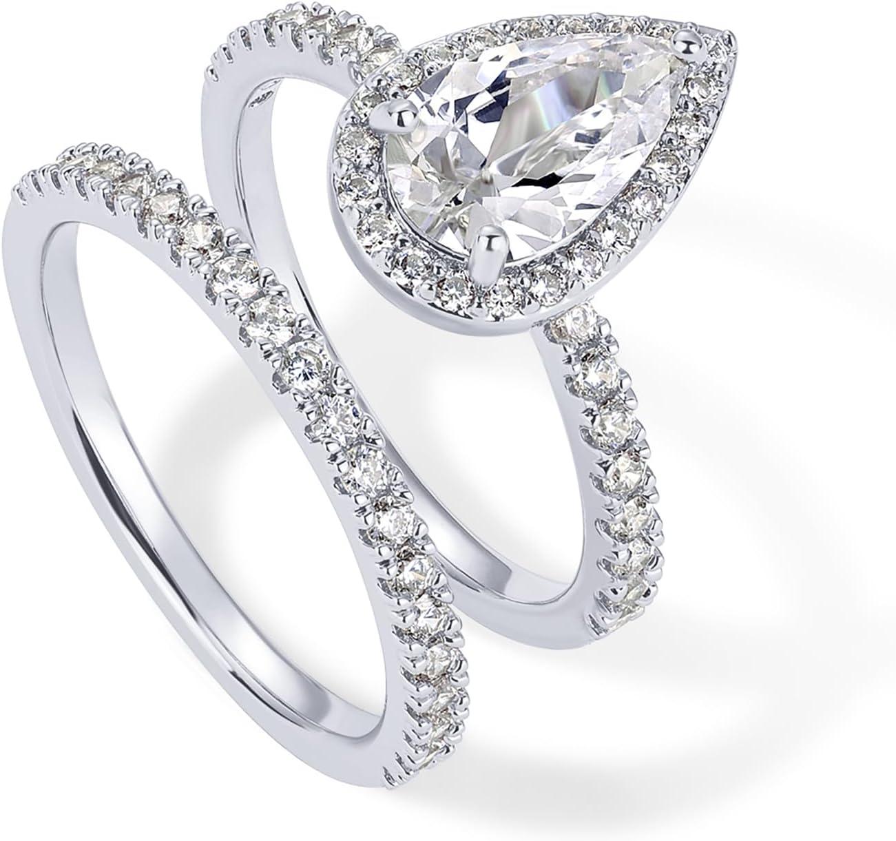 PAVOI 14K Gold Plated 1.7CT Pear Cubic Zirconia Eternity Engagement Ring Promise Ring Set for Women – Hidden Halo(White Gold)