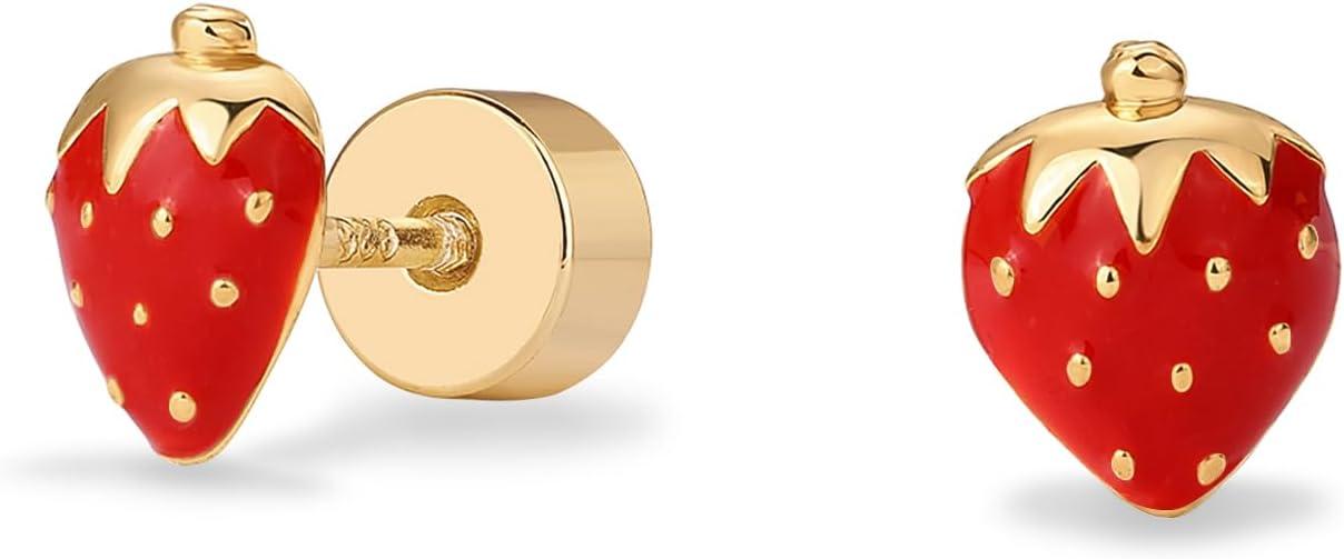 PAVOI 14K Gold Plated 925 Sterling Silver Posts Enamel Flatback Stud Earrings for Women – Colored Chili Pepper Strawberry Peach Cherry Emoji Screwback Earrings – Dainty Helix Cartilage Piercing Jewelry(Strawberry)