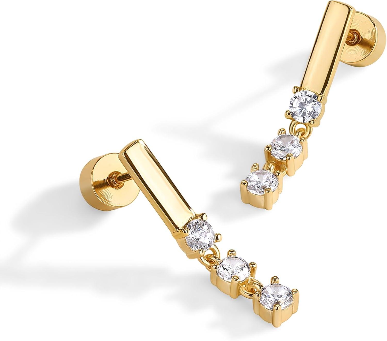 PAVOI 14K Gold Plated 925 Sterling Silver Posts Mini Bar Drop Dangle Flatback Earrings for Women | Dainty Helix Cartilage Piercing Jewelry | Baguette Bezel Marquise Pearl Cubic Zirconia Screwback Stud Earrings(Triple Stone)