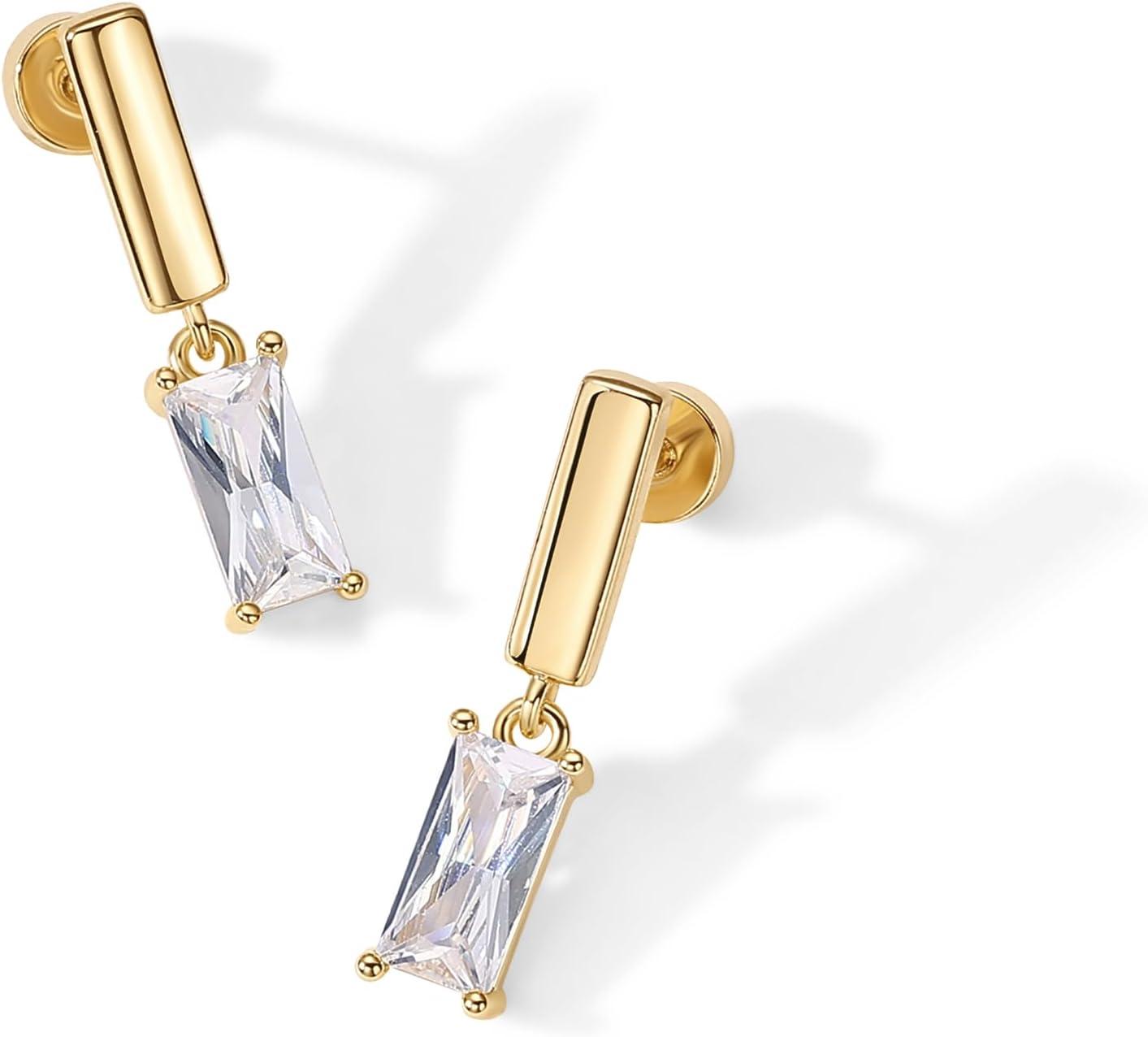 PAVOI 14K Gold Plated 925 Sterling Silver Posts Mini Bar Drop Dangle Flatback Earrings for Women | Dainty Helix Cartilage Piercing Jewelry | Baguette Bezel Marquise Pearl Cubic Zirconia Screwback Stud Earrings(Baguette)
