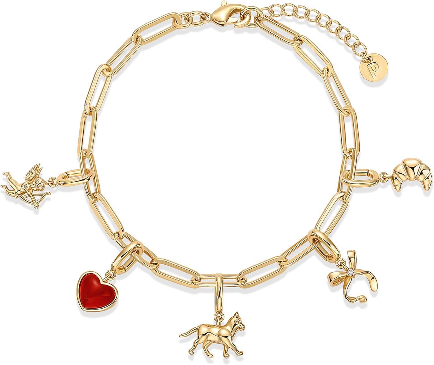 PAVOI 14K Gold Plated Adjustable Bracelet for Women | Twisted Bar & Paperclip Charm Chain Bracelets with Moon, Evil Eye, Teddy Bear, Heart Lock, Airplane, Dog, Cowboy Boot, Cat, Cupid & More | Fashion Jewelry(Cat)