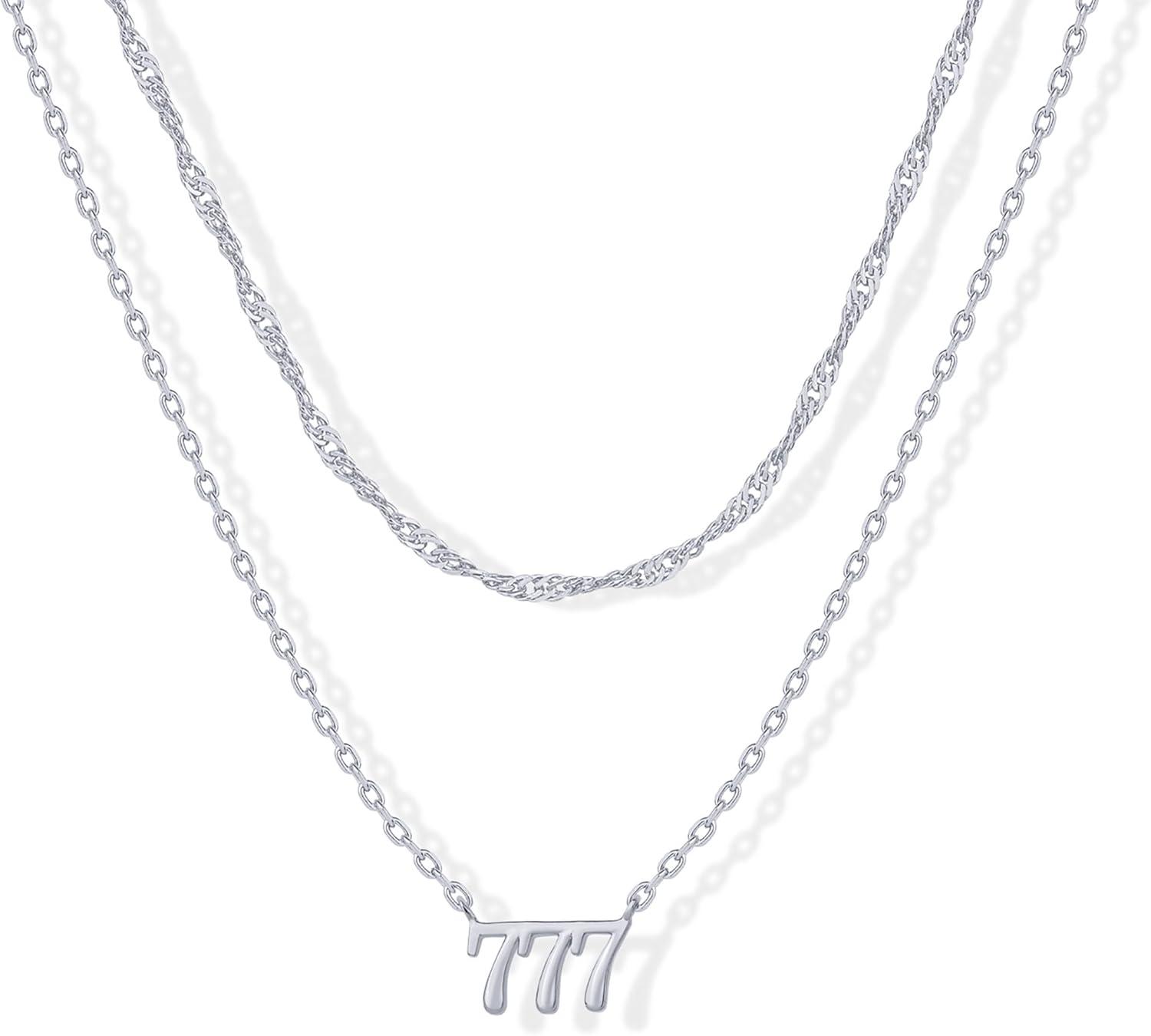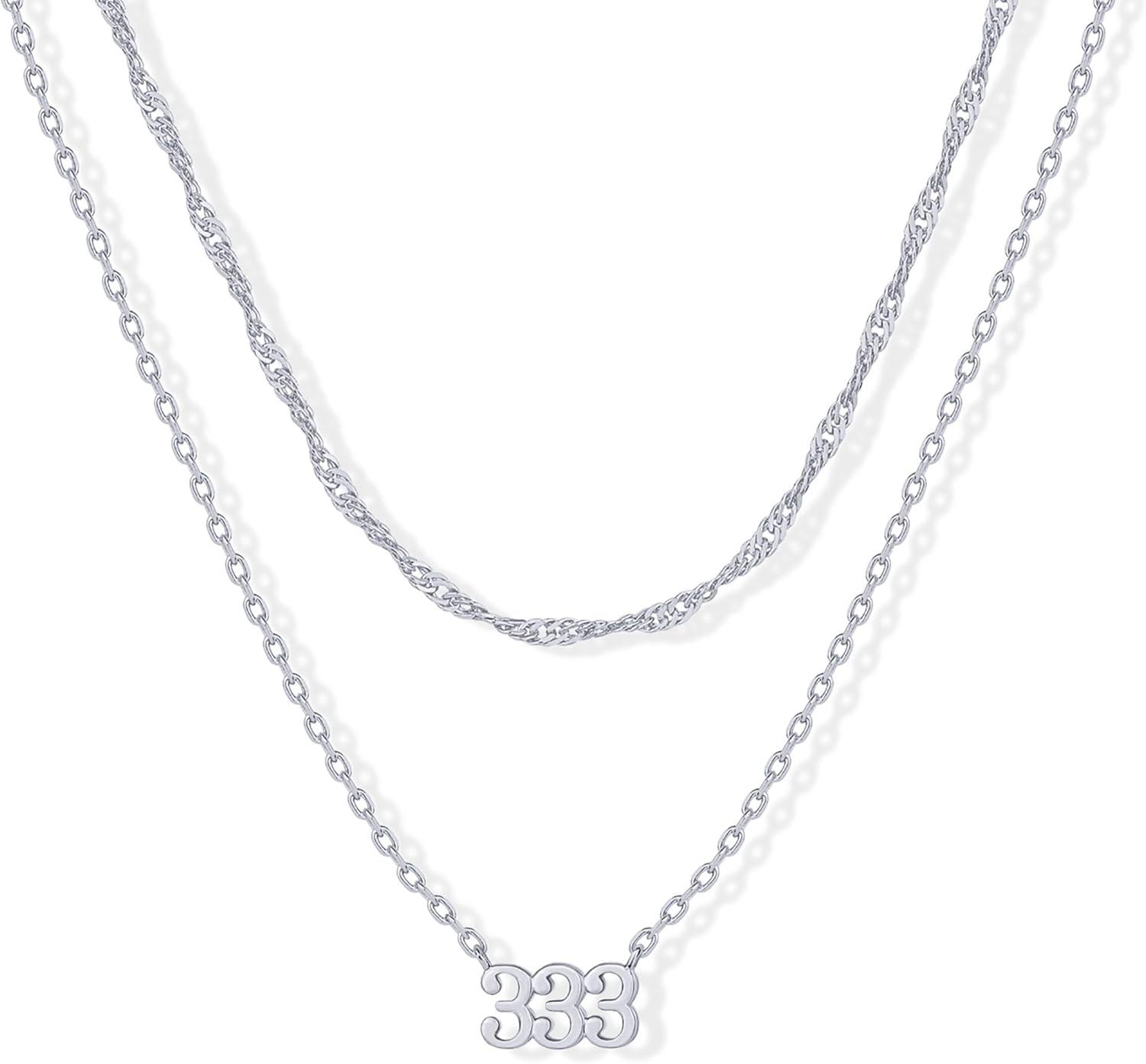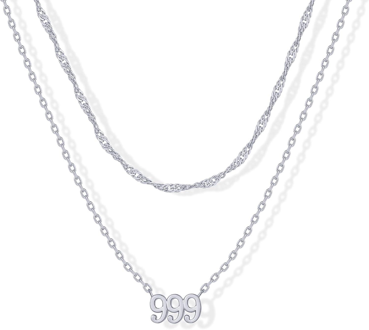 PAVOI 14K Gold Plated Angel Number Pendant Layering Necklace for Women | 999 Lucky Numerology Singapore Chain Necklace(White Gold)