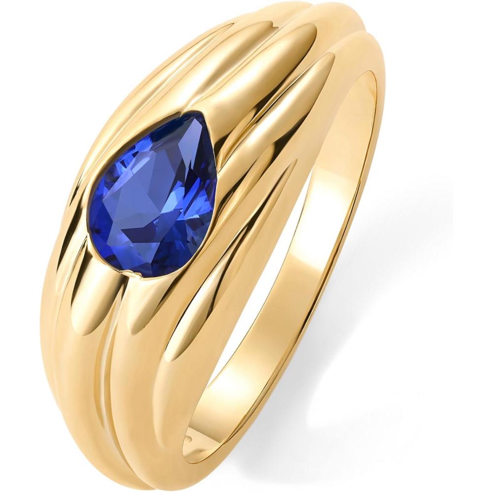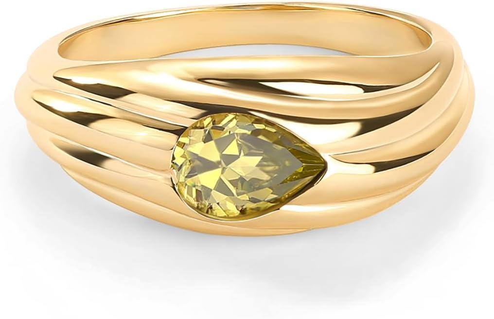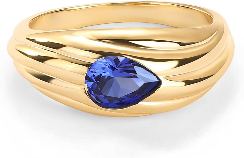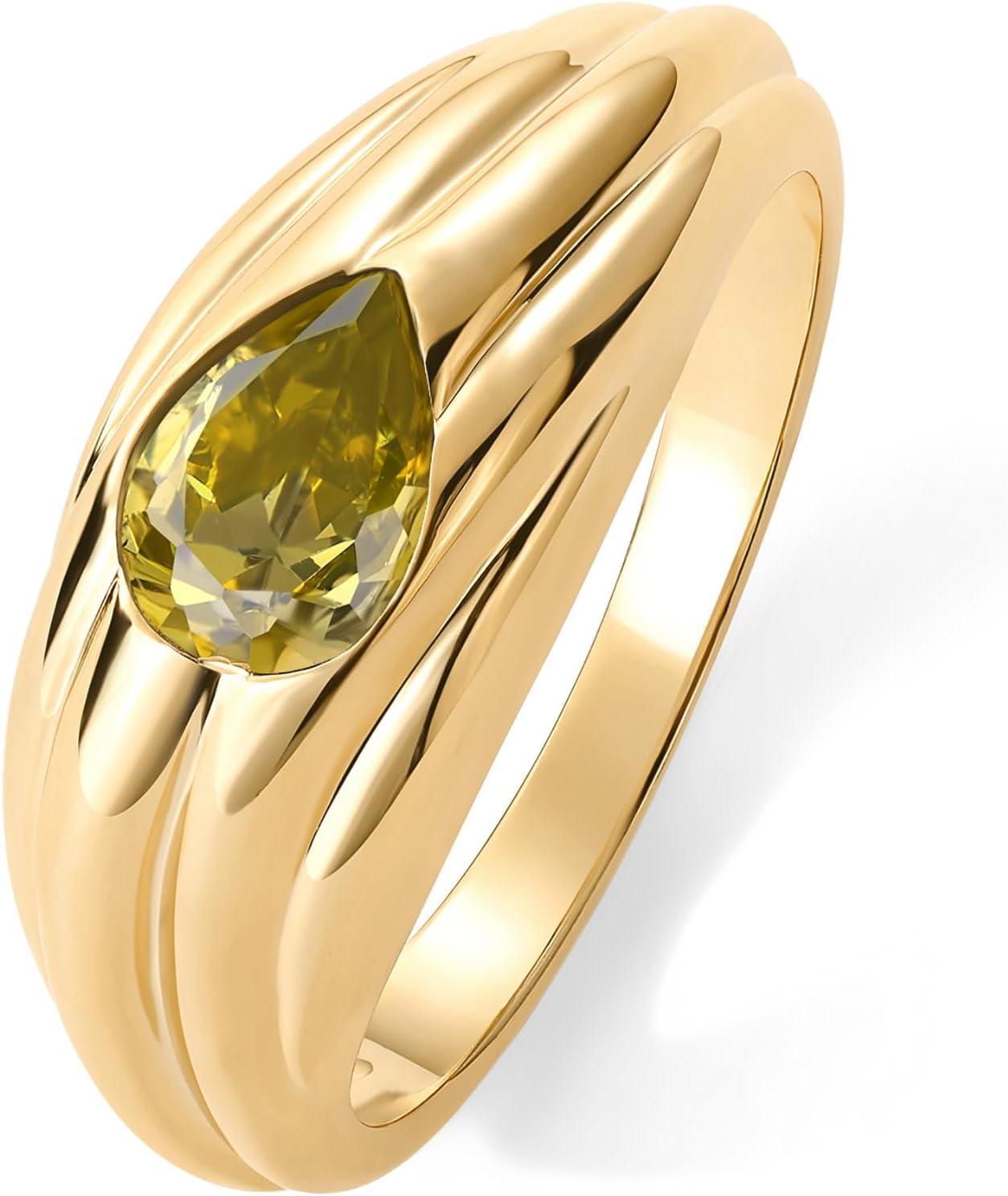 PAVOI 14K Gold Plated Chunky Colored Gemstones Statement Ring for Women | Blue Pink Green Pear Cubic Zirconia Stackable Wave Texture Bands(Yellow Gold)