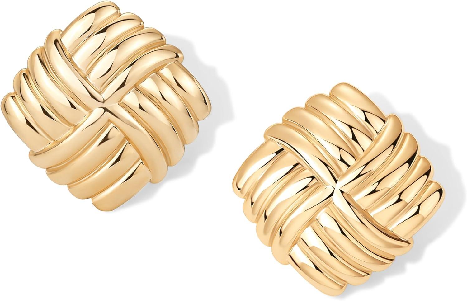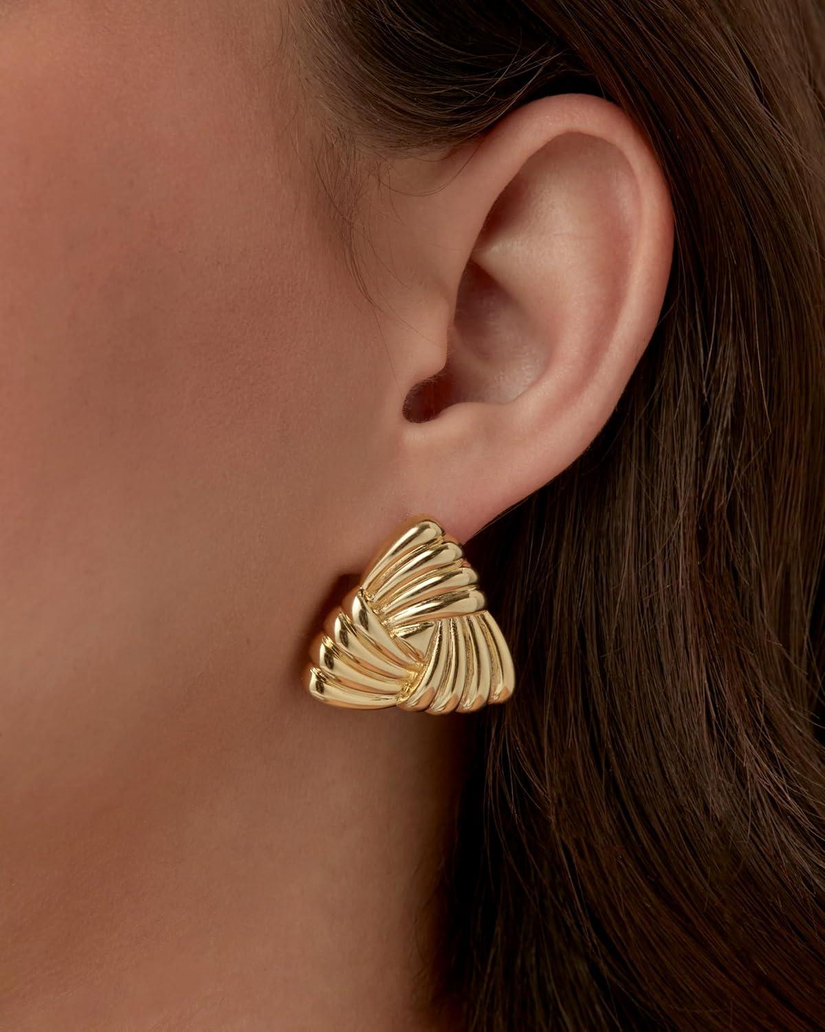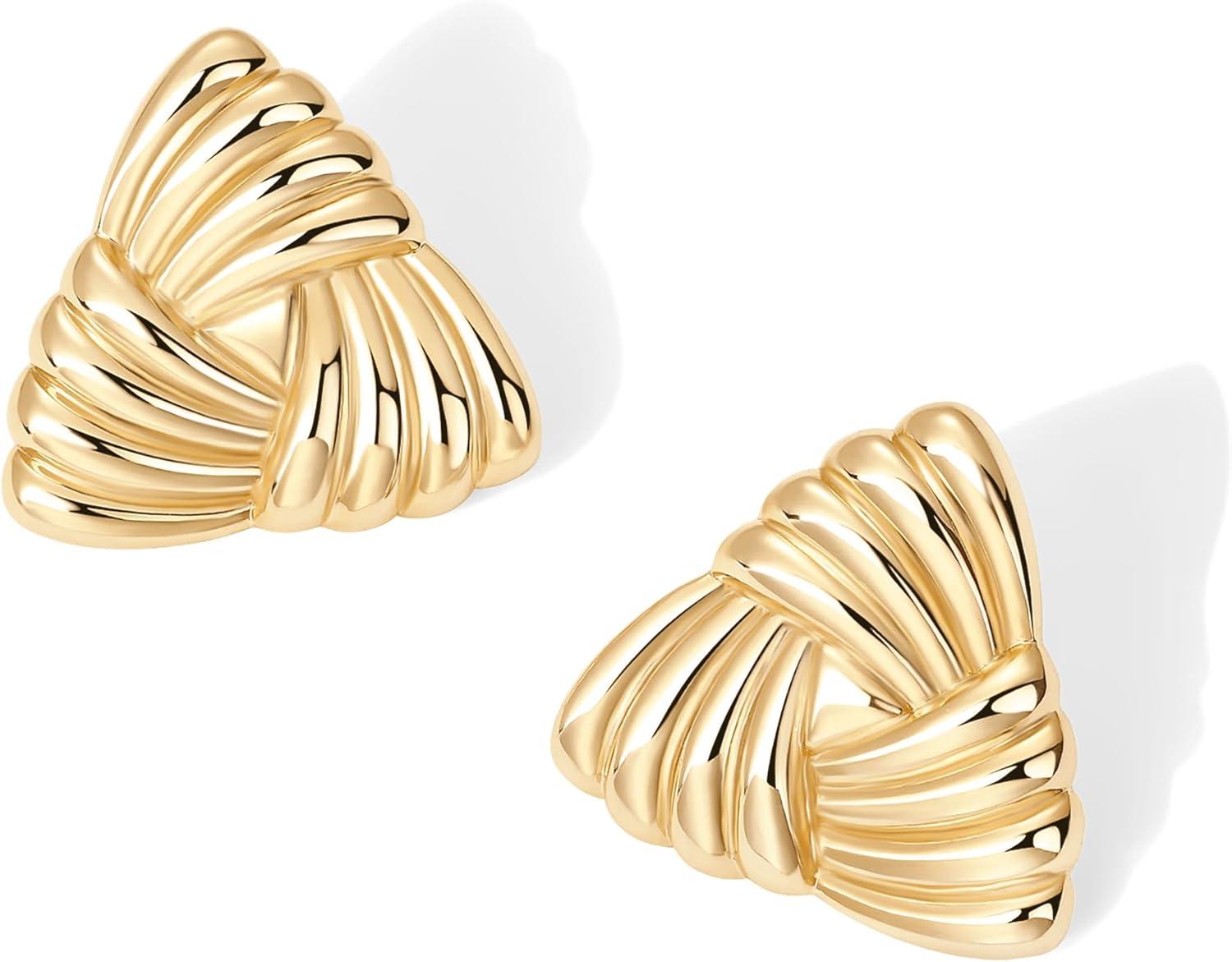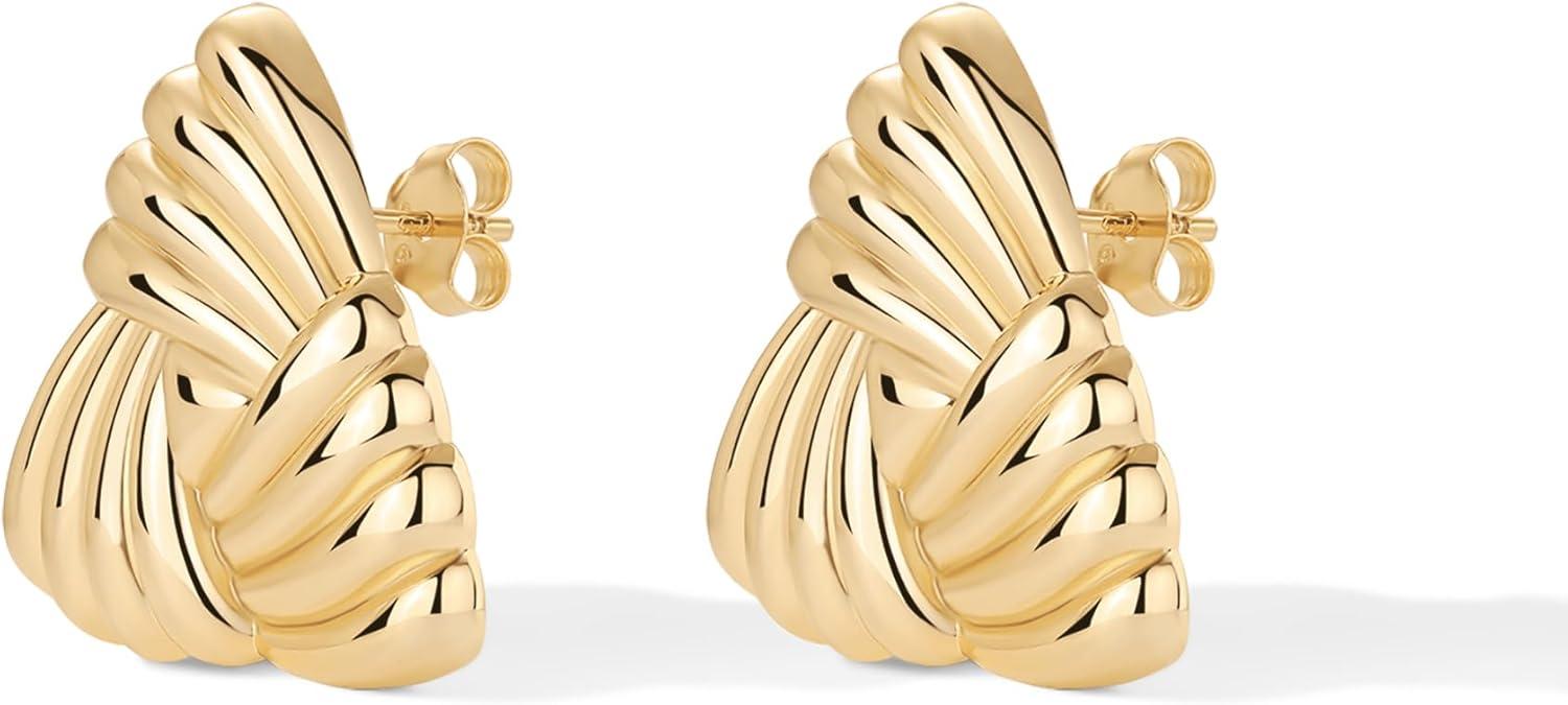 PAVOI 14K Gold Plated Chunky Vintage Earrings for Women – Trendy Textured Ribbed Knot Geometric Triangle Rope Button Seashell Wing Dangle Drop Stud Earrings Dupes(Yellow Gold)