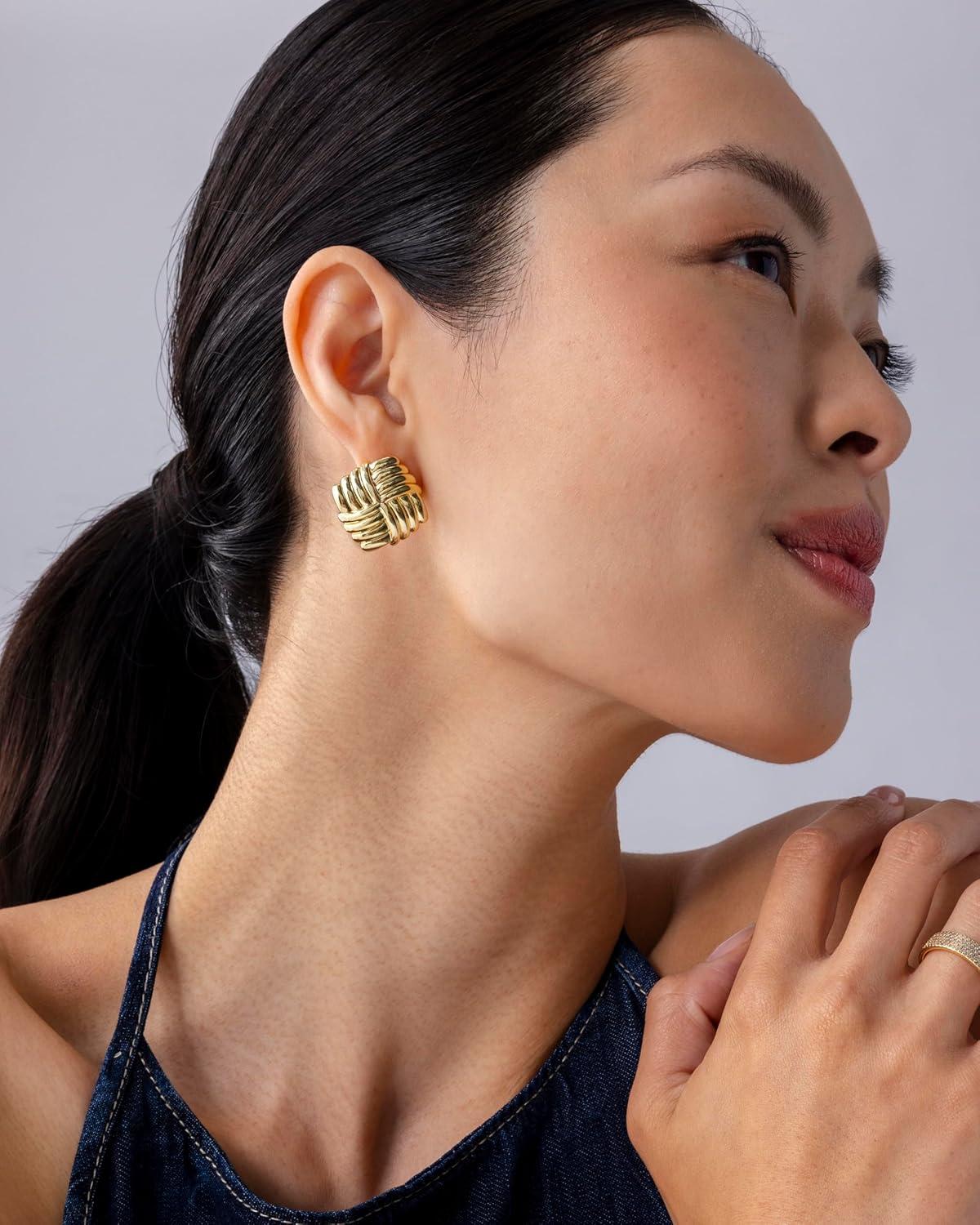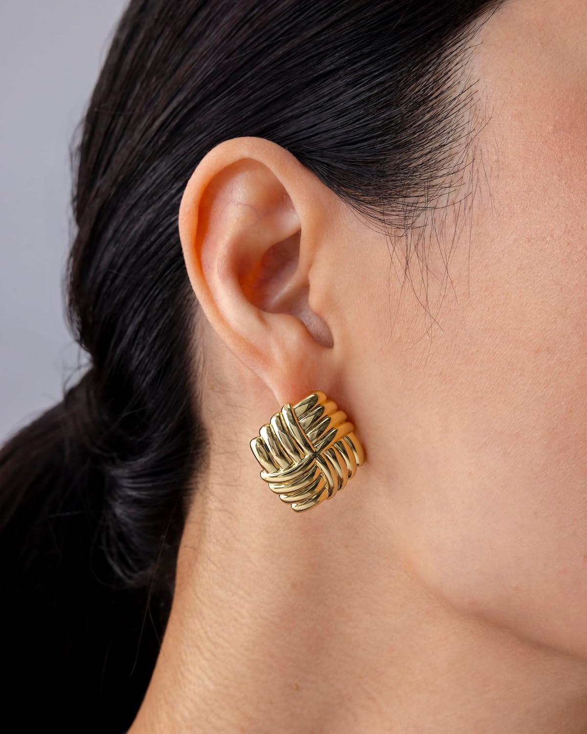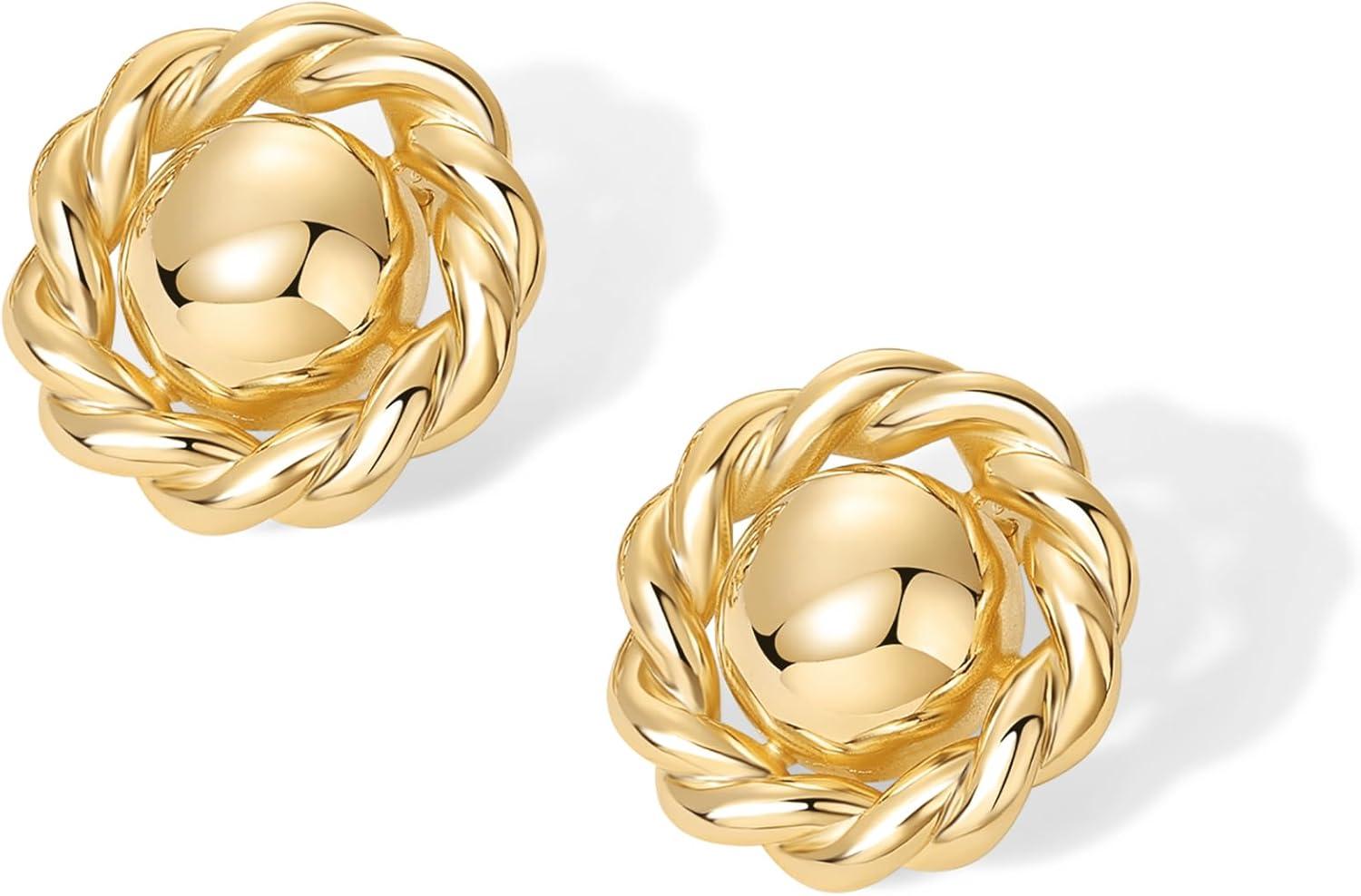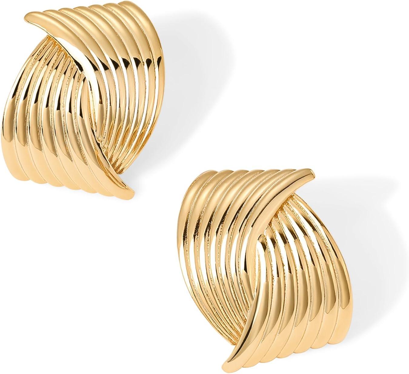 PAVOI 14K Gold Plated Chunky Vintage Earrings for Women – Trendy Textured Ribbed Knot Geometric Triangle Rope Button Seashell Wing Dangle Drop Stud Earrings Dupes(Yellow Gold)