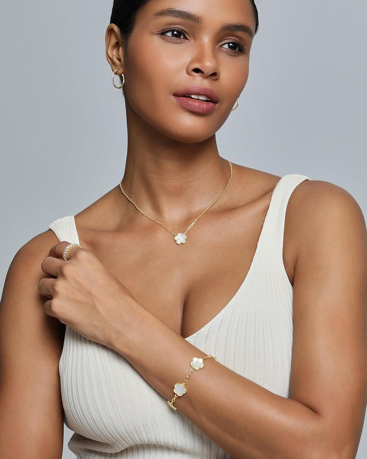 Elevate your everyday elegance with this stunning flower jewelry piece that captures the timeless charm of four leaf clover jewelry in a sophisticated 14K gold plated design. This exquisite flower necklace features a dainty 13mm pendant adorned with mother of pearl gemstones or genuine black onyx, creating the perfect balance of luxury and wearability. The versatile 16″ + 2″ chain length ensures a flattering fit for any neckline, while the intricate clover pendant necklace design makes it an ideal lucky necklace for women seeking both style and symbolism. Whether you're drawn to the classic appeal of a gold flower necklace with a pearl gemstone or prefer the understated sophistication of a black onyx floral necklace aesthetic, this spring jewelry piece seamlessly transitions from day to night with effortless grace. The dainty yet distinctive silhouette makes it ideal for layering with other pieces or wearing solo as a statement, while the symbolic four-leaf flower brings an element of positivity to your jewelry collection.