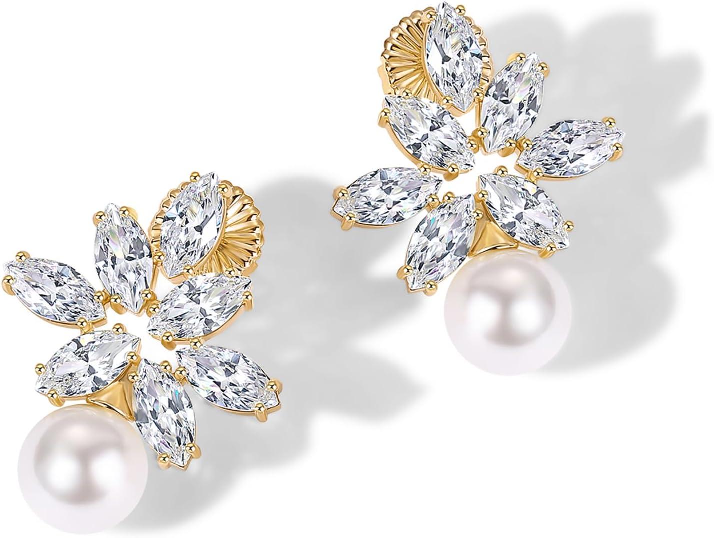 PAVOI 14K Gold Plated Cubic Zirconia Stud Earrings for Women – 925 Sterling Silver Posts Statement Crystal Cluster Wedding Earrings for Brides & Bridesmaids – Trendy CZ Pearl Studs Wedding Jewelry(Yellow Gold)
