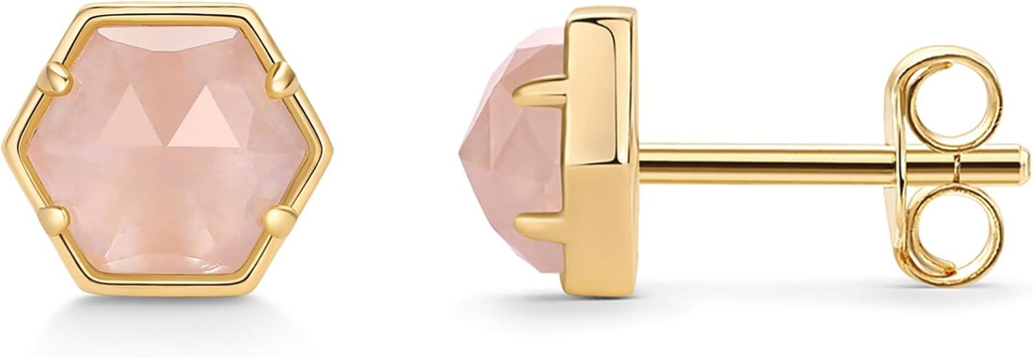 PAVOI 14K Gold Plated Hexagon Gemstone Stud Earrings for Women | Natural Birthstone Earring Pair(Rose Quartz)
