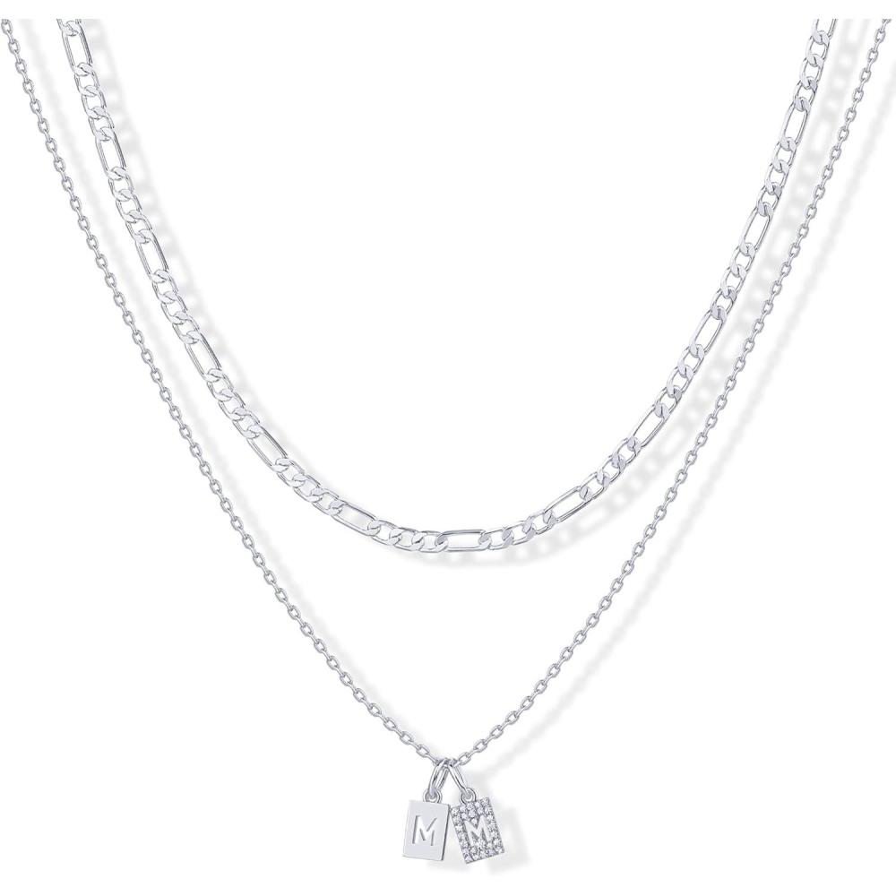 PAVOI 14K Gold Plated Initial Letter Double Dog Tag Pendant Necklace | Dainty Cubic Zirconia Letter Tag Round Box Chain Necklaces for Women(- M)