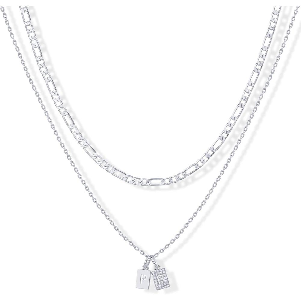 PAVOI 14K Gold Plated Initial Letter Double Dog Tag Pendant Necklace | Dainty Cubic Zirconia Letter Tag Round Box Chain Necklaces for Women(- P)