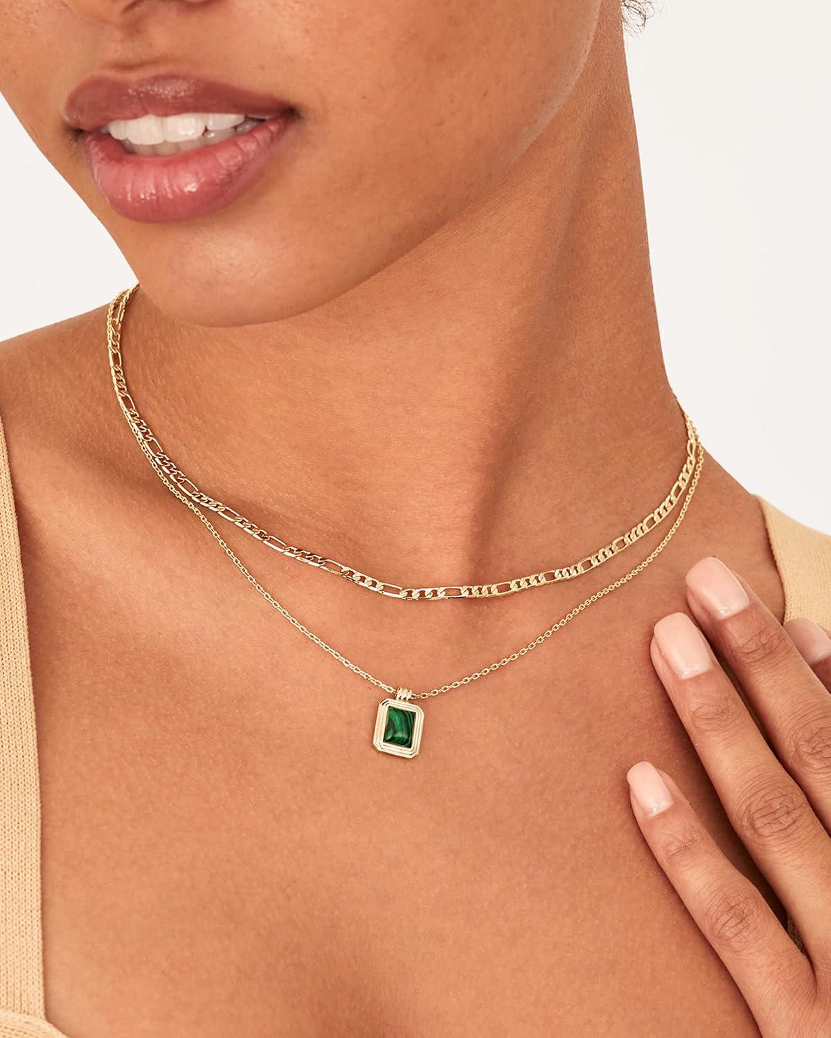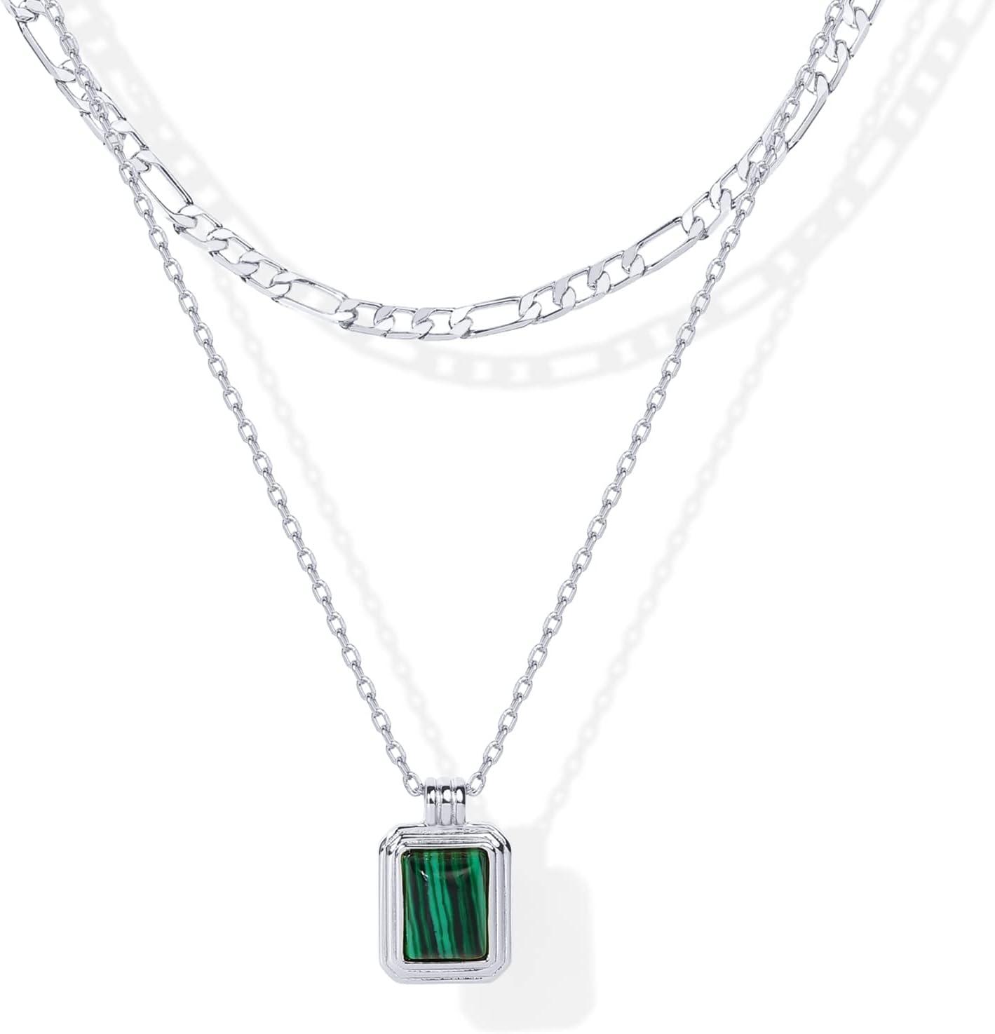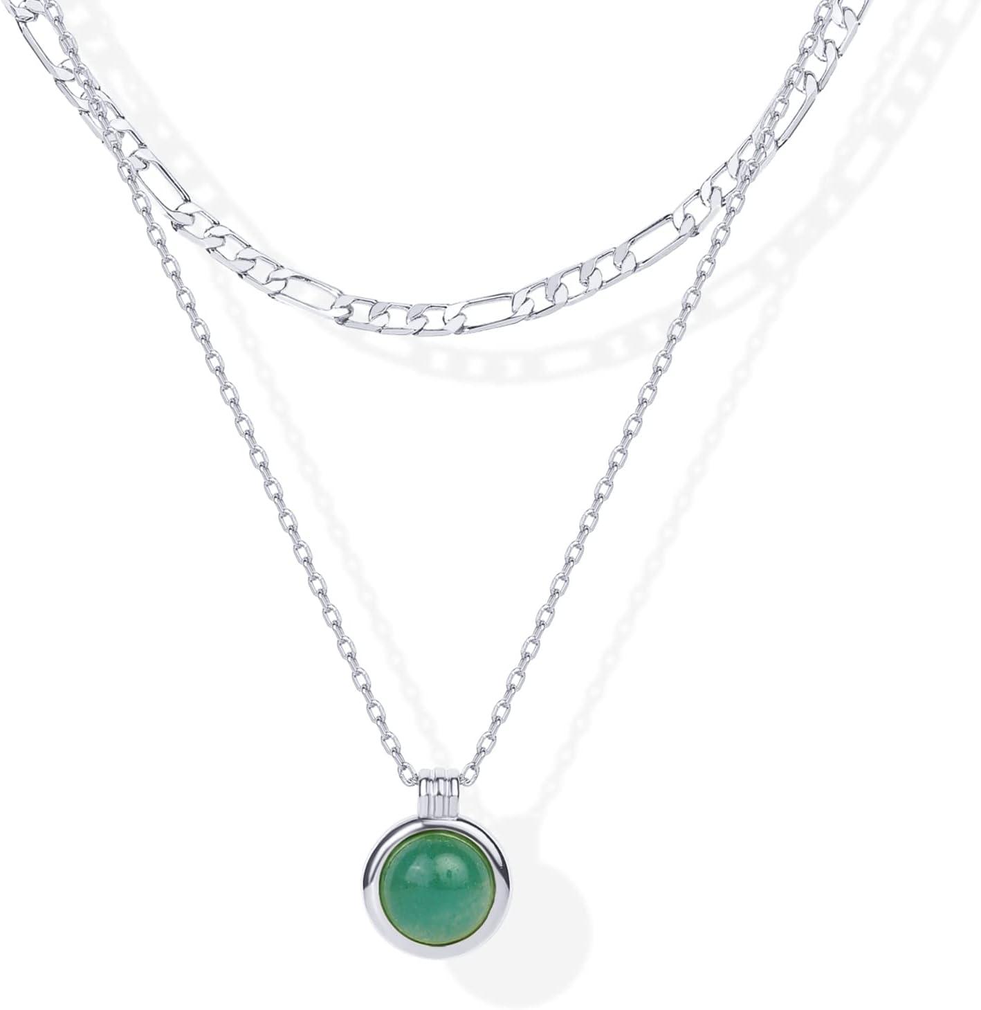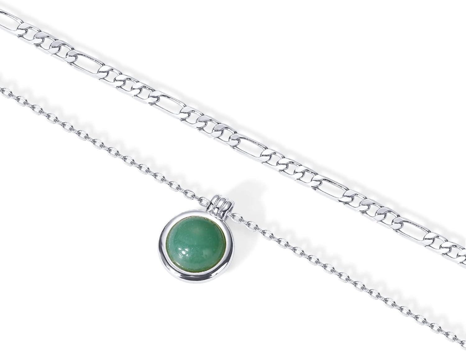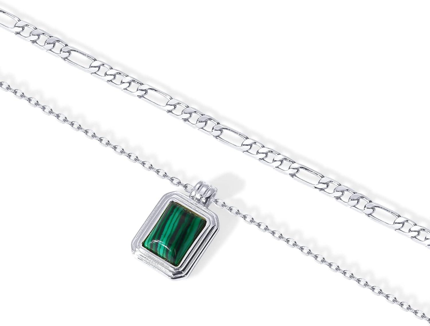 PAVOI 14K Gold Plated Layered Necklaces for Women | Gemstone Pendant Figaro Chain Necklace | Carnelian, Green Aventurine, Malachite Layering Necklace(White Gold)