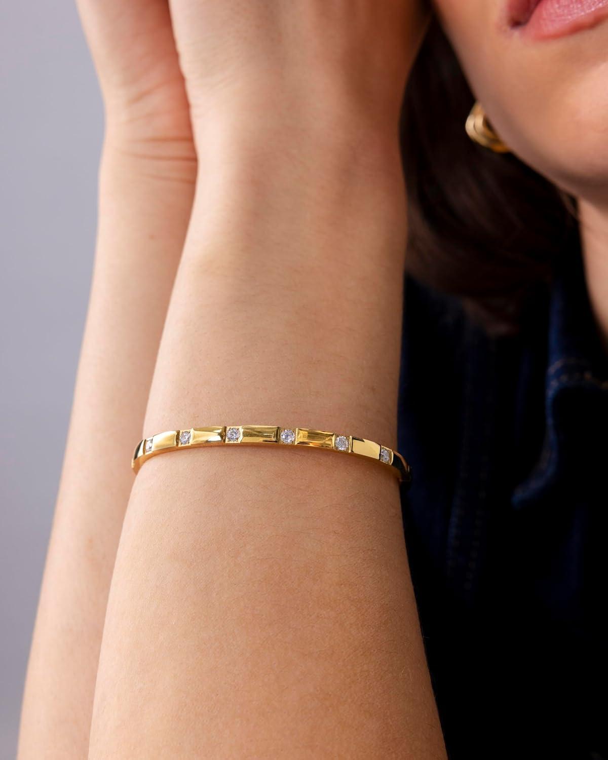 Keep it simple with an iconic bangle featuring subtle shine inspired by the classic look you love. We combined premium cubic zirconia stones with 14k gold plating to make sure you never dull your sparkle. Designed to be the star of your stack or stand alone. Plus, it's sensitive-skin safe and is made without nickel, cadmium, and lead.