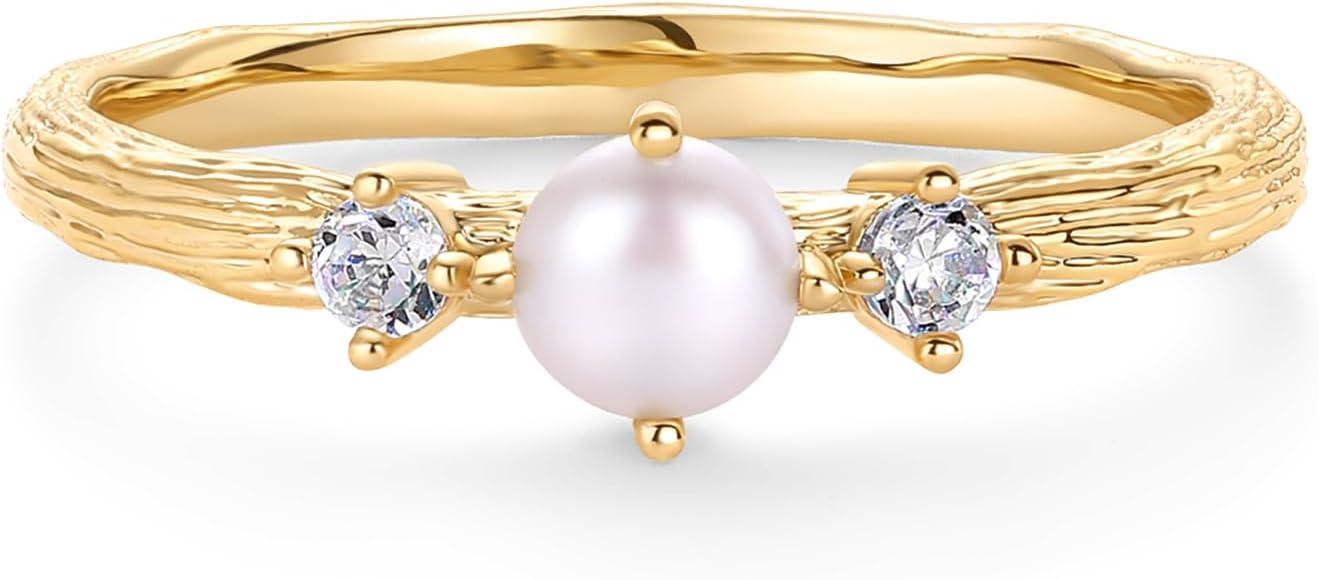 PAVOI 14K Gold Plated Pearl Hammered Ring for Women | Dainty Elegant Stackable Cubic Zirconia Thin Band for Women(Yellow Gold)