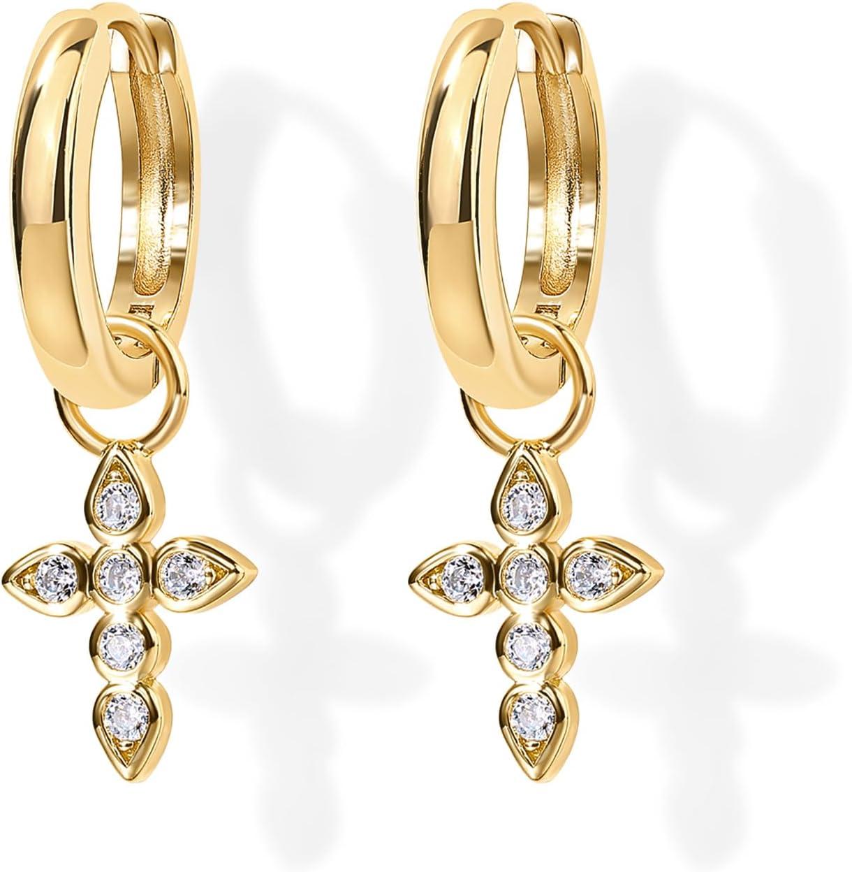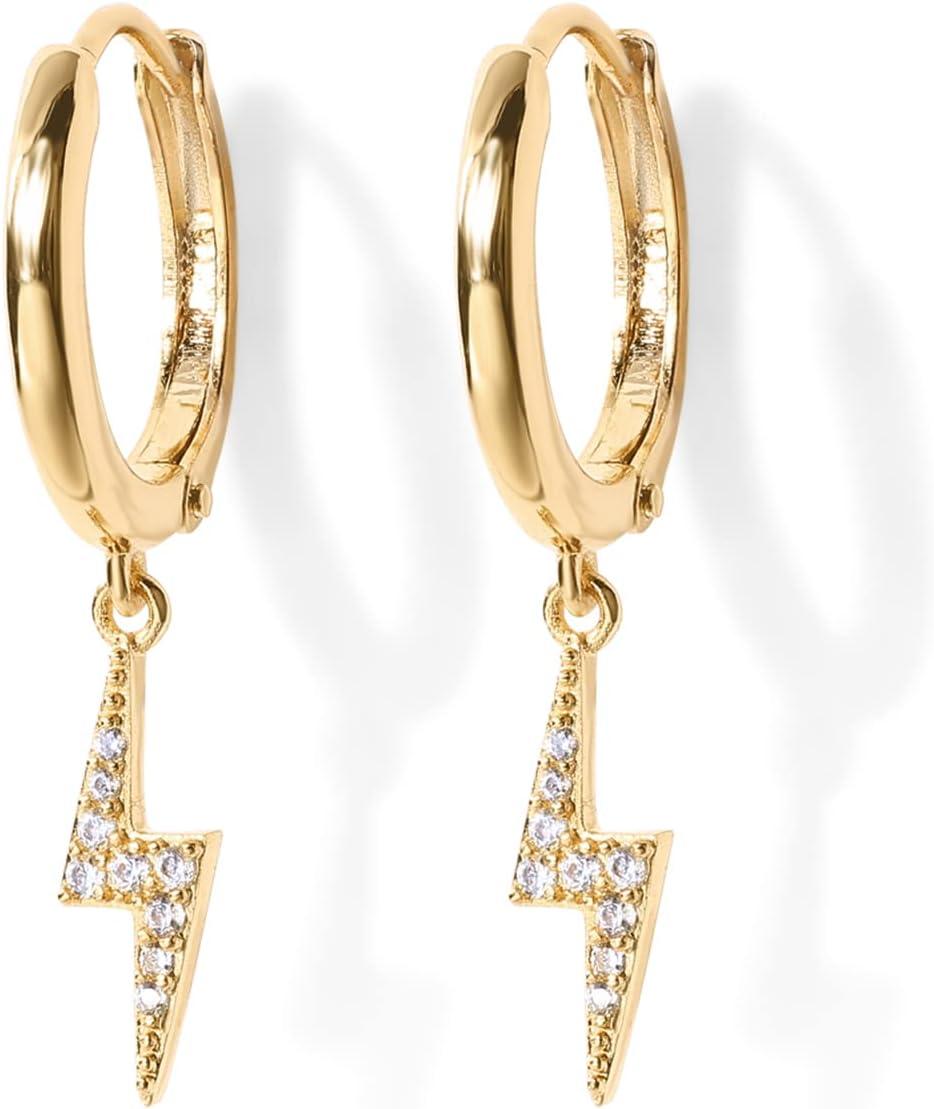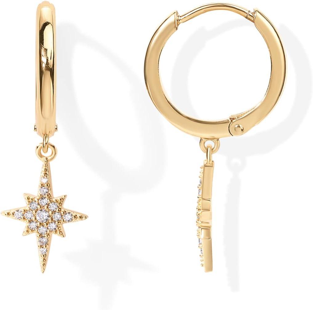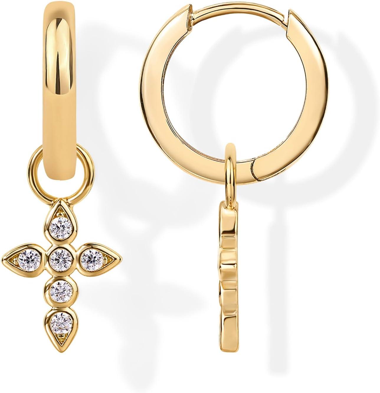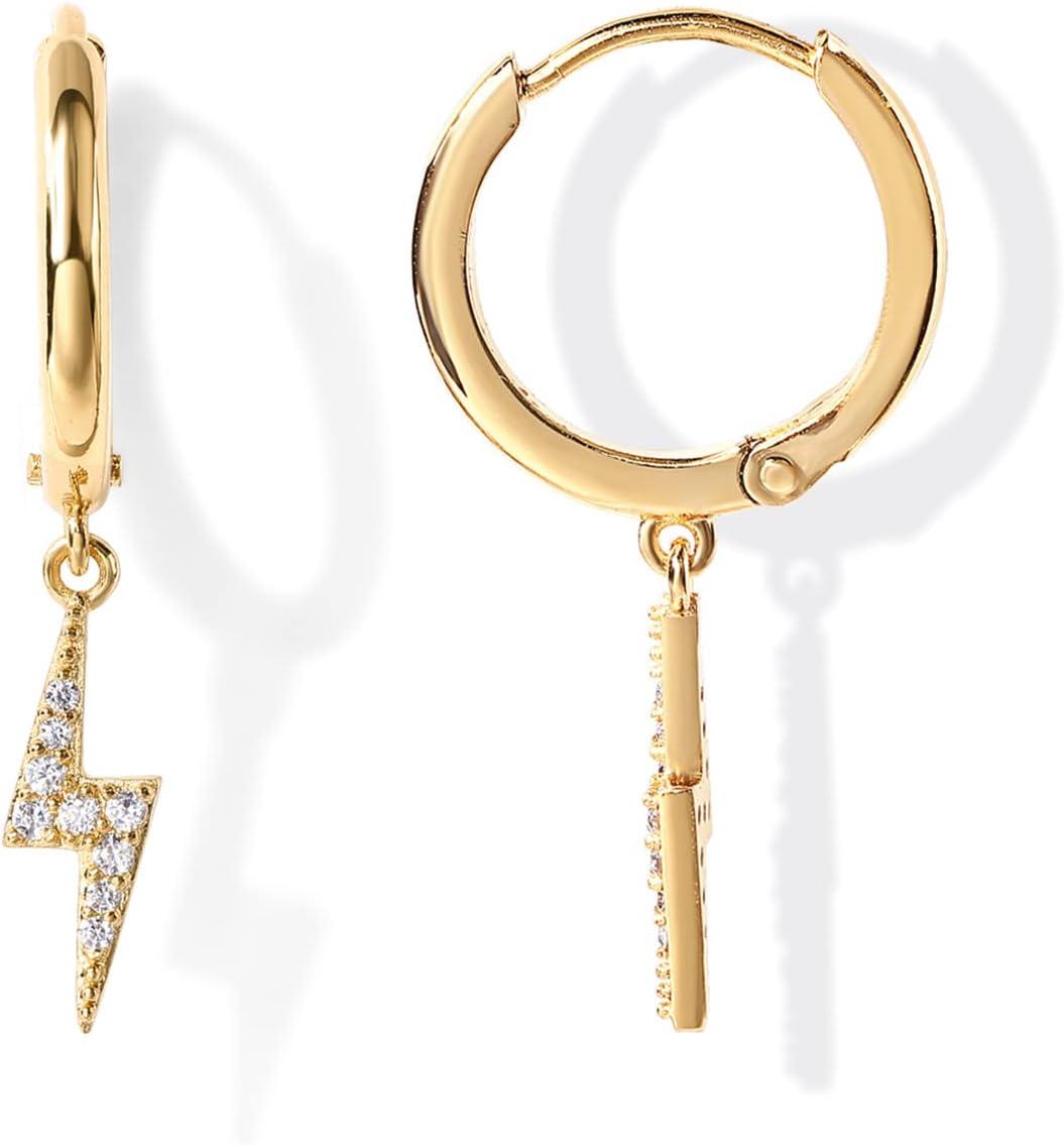 PAVOI 14K Gold Plated S925 Sterling Silver Post Lightweight Drop Dangle Huggie Hoop Earrings for Women | Star, Lock, Pearl, Cross, Lightening, Coin | Dainty Earrings(Yellow Gold)