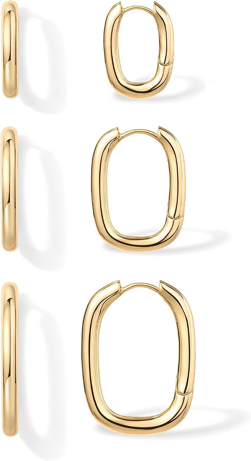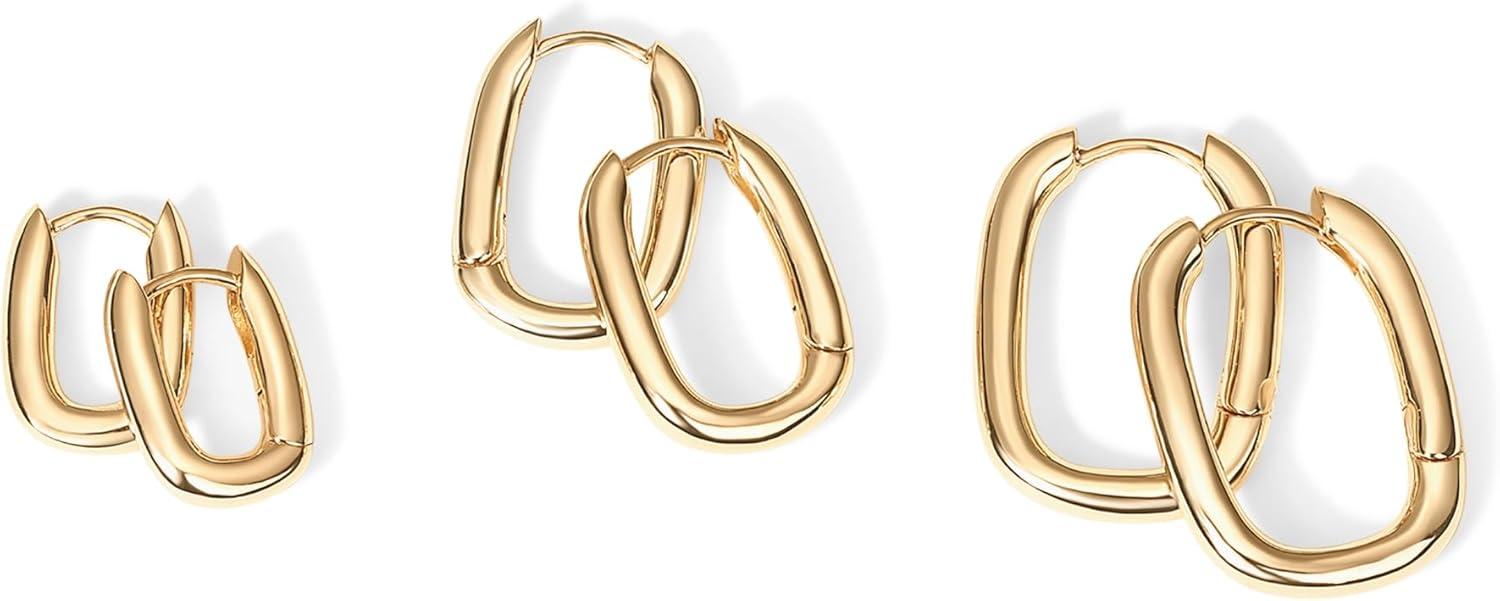 PAVOI 18K Gold Plated 925 Sterling Silver Posts Small Hoop Earrings for Women – Trendy Geometric Plain Chunky Huggie Earscape Piercing Pack – Everyday Gold Hoop Earrings Set(Rectangle)